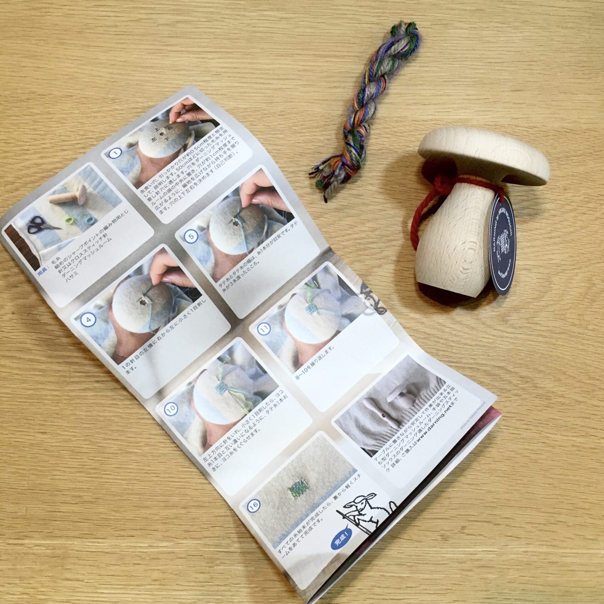 ちなみにこの教室では、参加者用にダーニングマッシュルームをご用意していますが、おうちでやる際には、ガチャガチャのケースや電球、こけしなどでも代用ができるそうな。