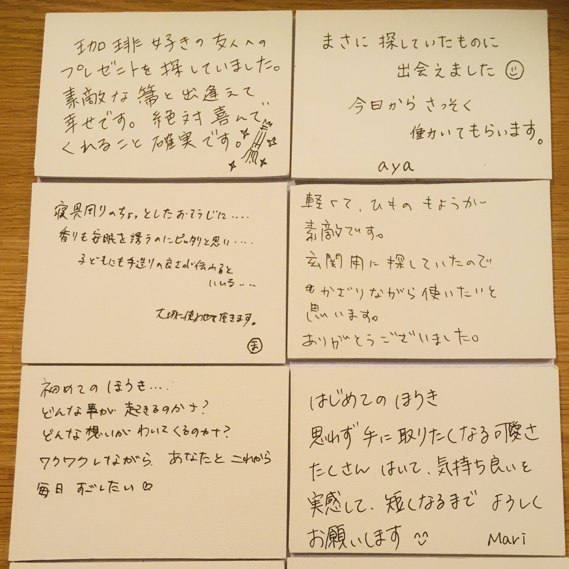 また、今回、ひみつの小店に実際にお越しいただき、箒を持ち帰ってくださった方々に、購入の際、職人さんへのメッセージを書いてもらっていました。
