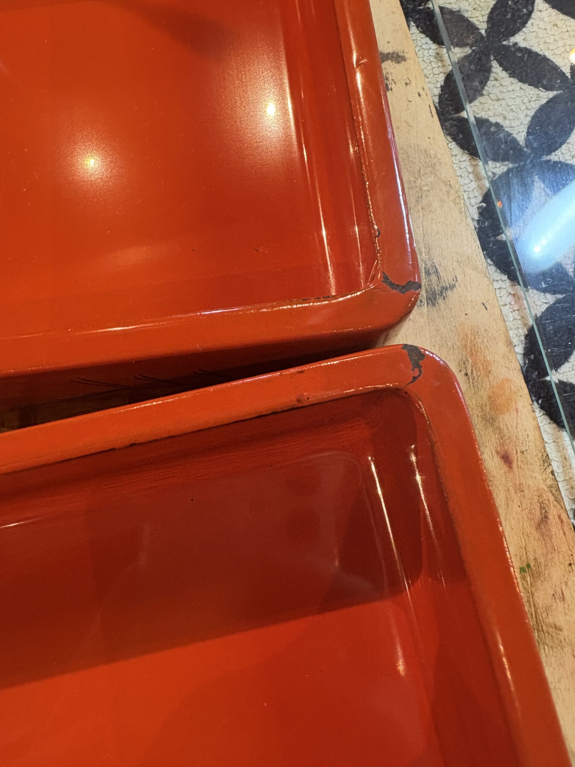 前回、みなさんそれぞれの<欠け>や<ヒビ>などのある漆器に、錆漆で破損部分をしっかり埋めていく作業を行いました。今回は、まずは前回の部分がちゃんとできているかのチェックから!