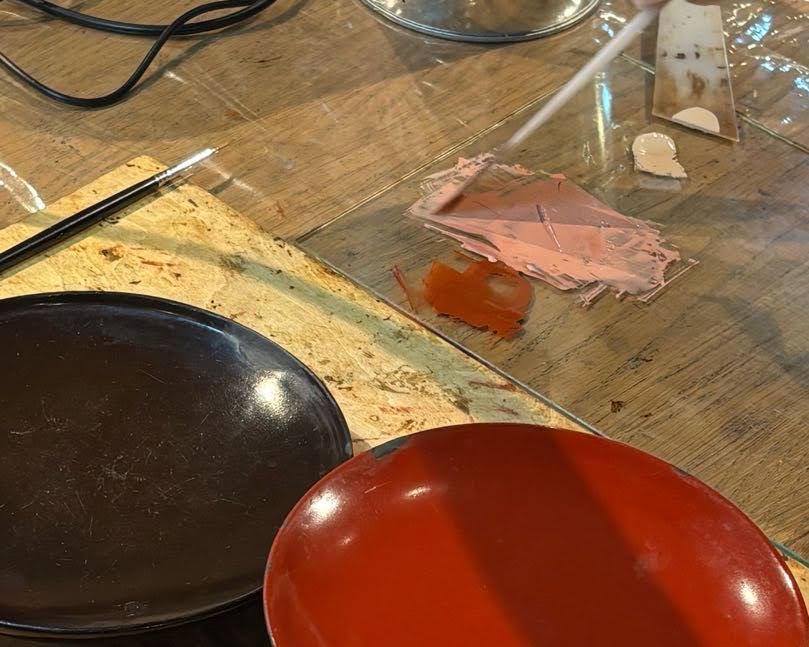 定番色の漆をそのまま使う方もいれば、2種類の漆をガラス板の上でヘラを使って混ぜ合わせ、好みの色を作りだす方もいらっしゃいました。