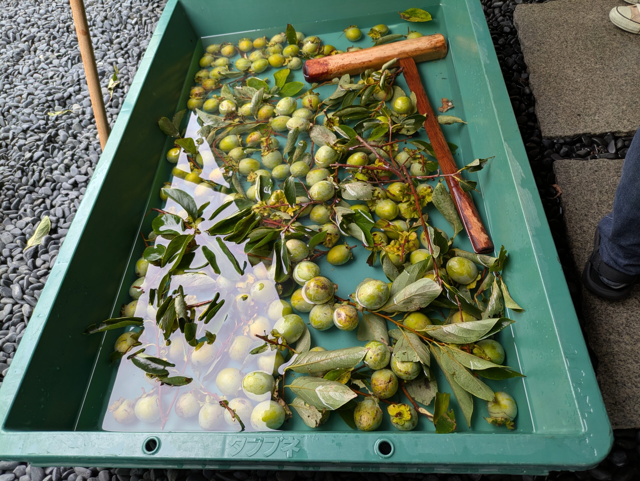 皆さんが今日、使う渋柿は昨日のうちに小川さんが収穫してくださって、お水に浸かって待機中でした。