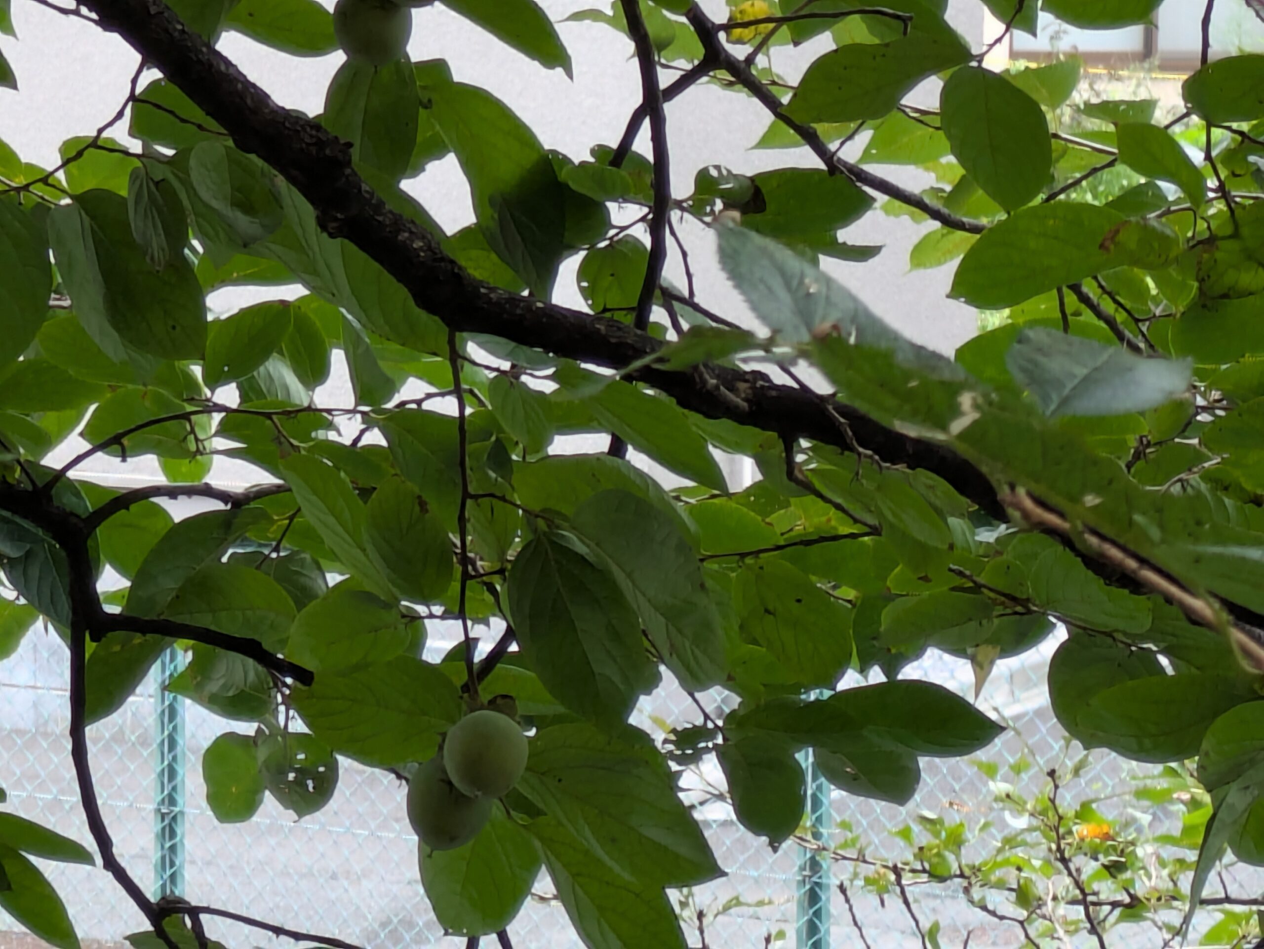 ちょっと見えにくいけど青々と茂った葉の中に青い柿の実が。