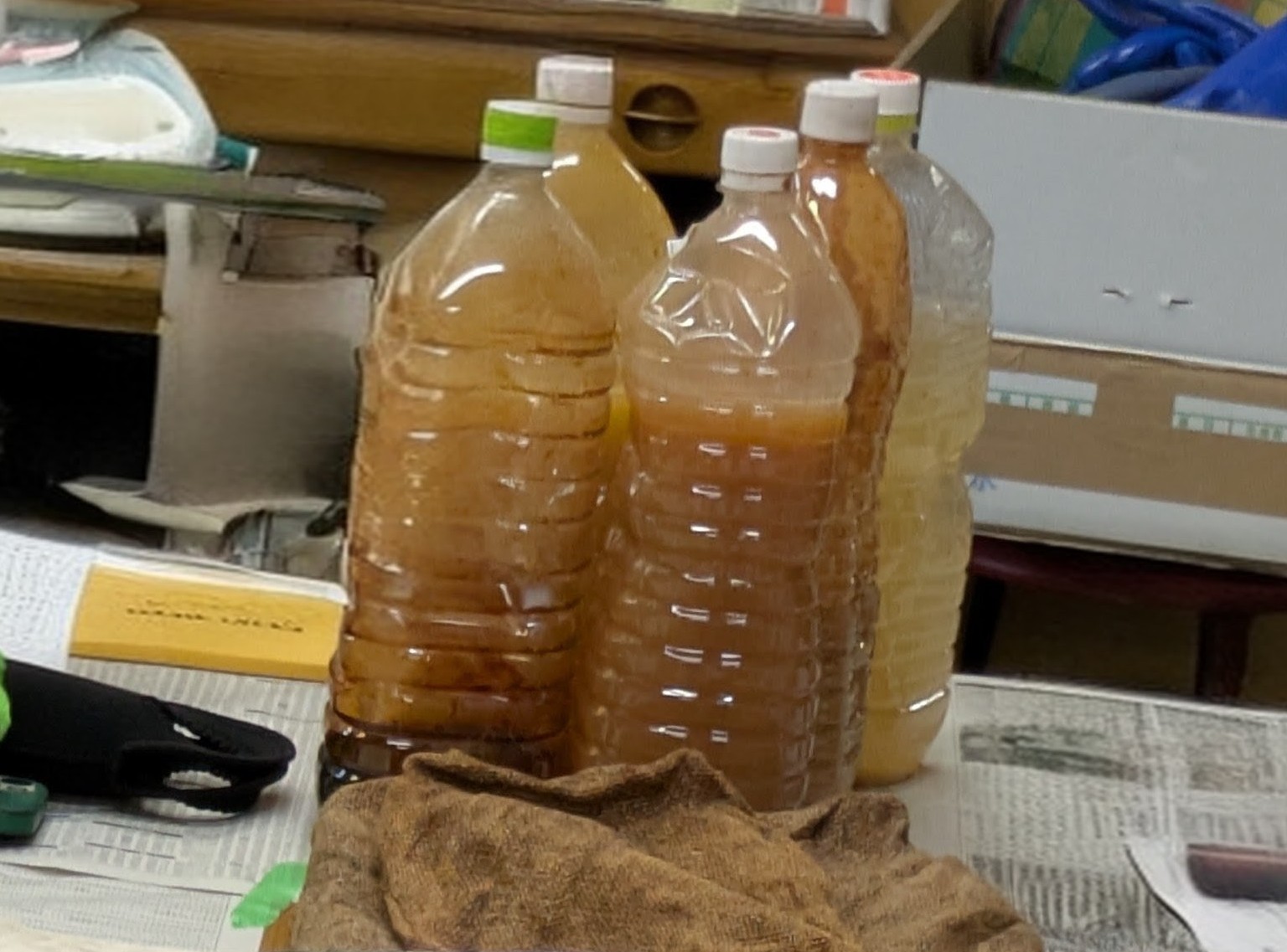 こちらは先生が何年もかけて育てた柿渋染料たち。おそるおそる臭いをかいでみると、お酢のようなツンとした臭いの後になんとも芳醇な香りがありました。一番古いのは10年物!ビンテージ級の柿渋染料です。ですが、先生はこれと同じ染料を再現できなくて試行錯誤してらっしゃるそうです。