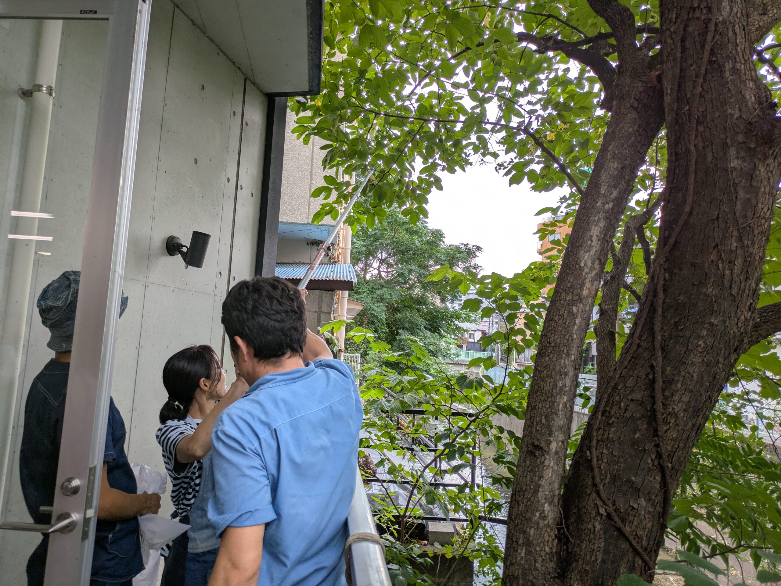 聞きたいことは山ほど、質問もたくさん飛び交ってとても深~い時間でしたが、座学はこの辺で切り上げて柿渋の染料作りを始めましょう!まずは工房裏の川辺に植えてある柿の木から、代表の方に収穫体験を。高枝切り挟みで落とさないように。手前の人がキャッチして。