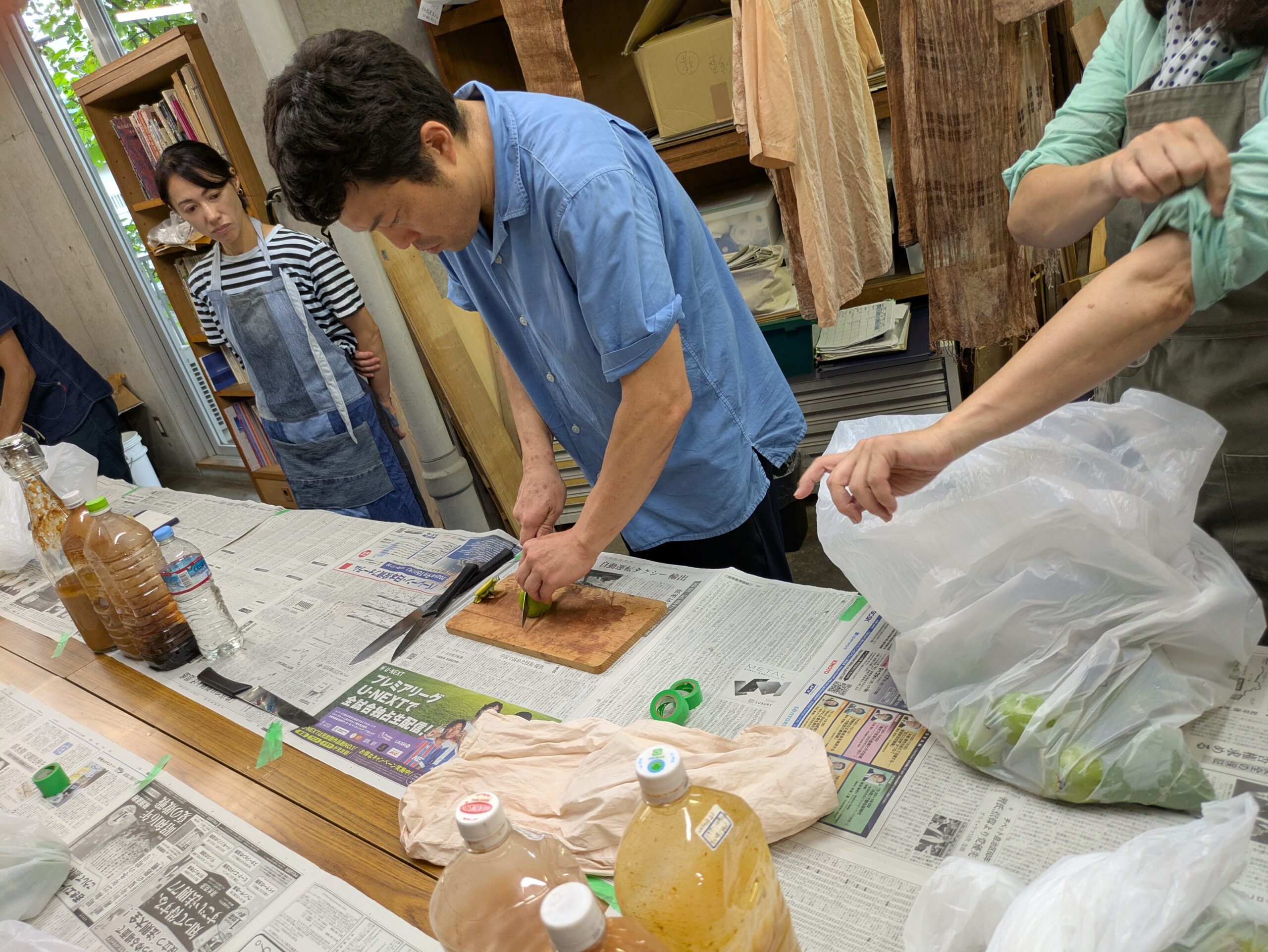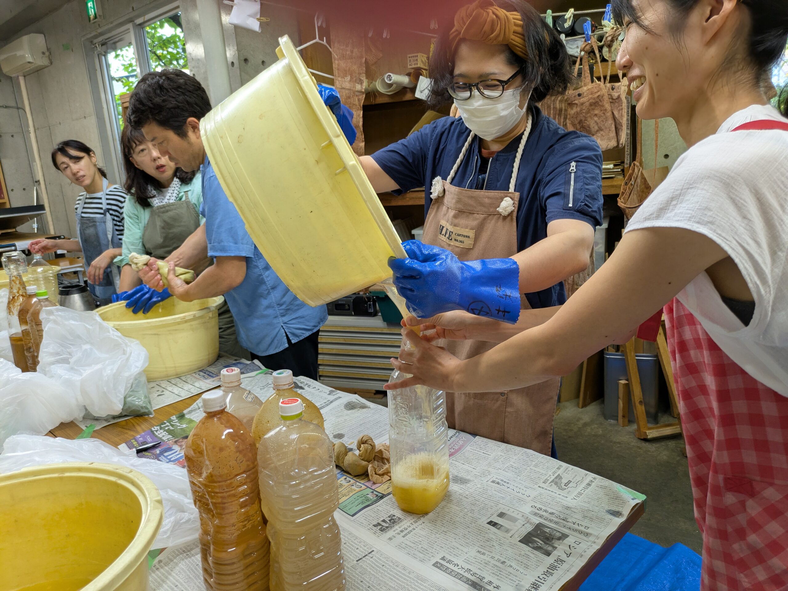 皆さんの作業が落ち着いたところで、これからどうやって柿渋染料に育てていくのか。管理、保存の方法を先生に教えてもらって本日は終了。次回、後半のワークショップでは柿渋染料を使ってサコッシュを染めていきます。