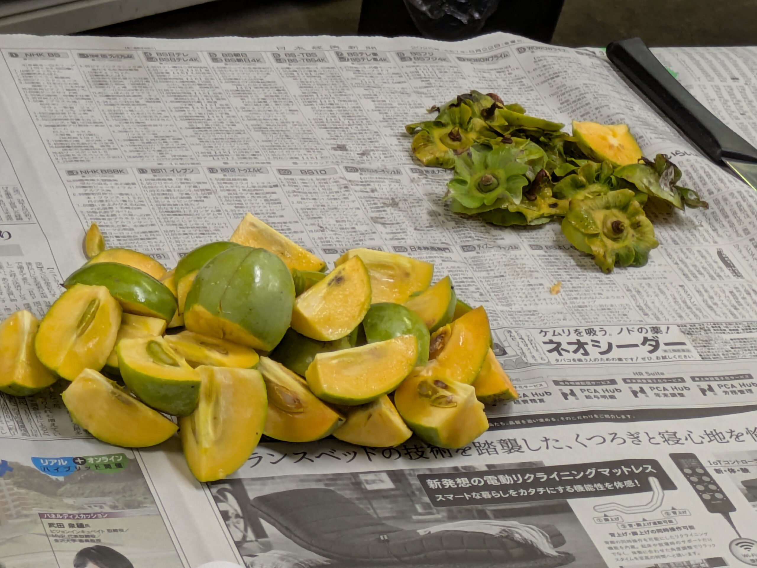 皮はまだ青々とした渋柿。中はもう黄色いんですね。柿特有のぬめりもあります。