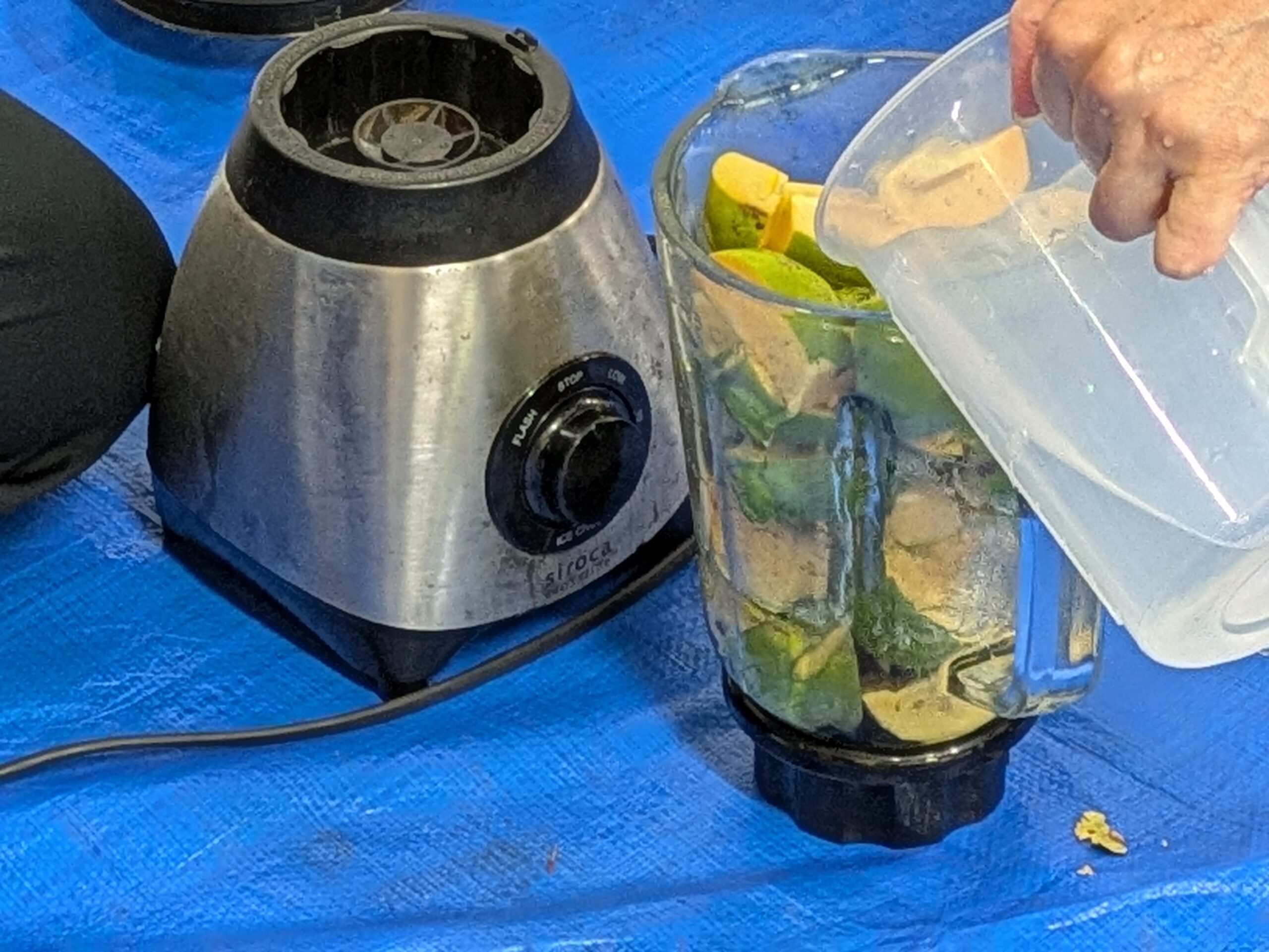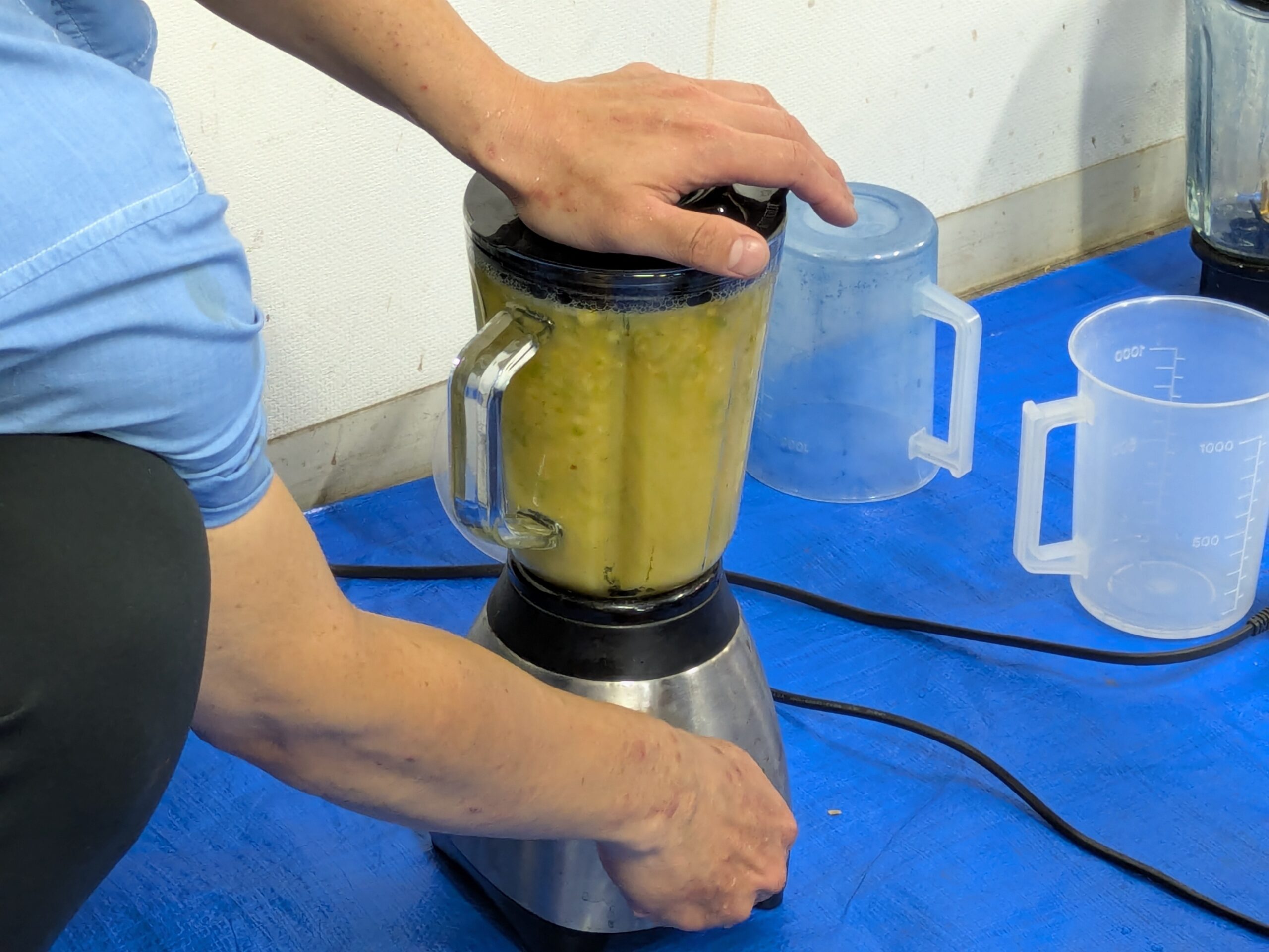 絞った汁はペットボトルへ。私が漏斗を押さえるね!と共同作業も終盤です。お隣では小川さんが最後のひと絞りをお手伝い。