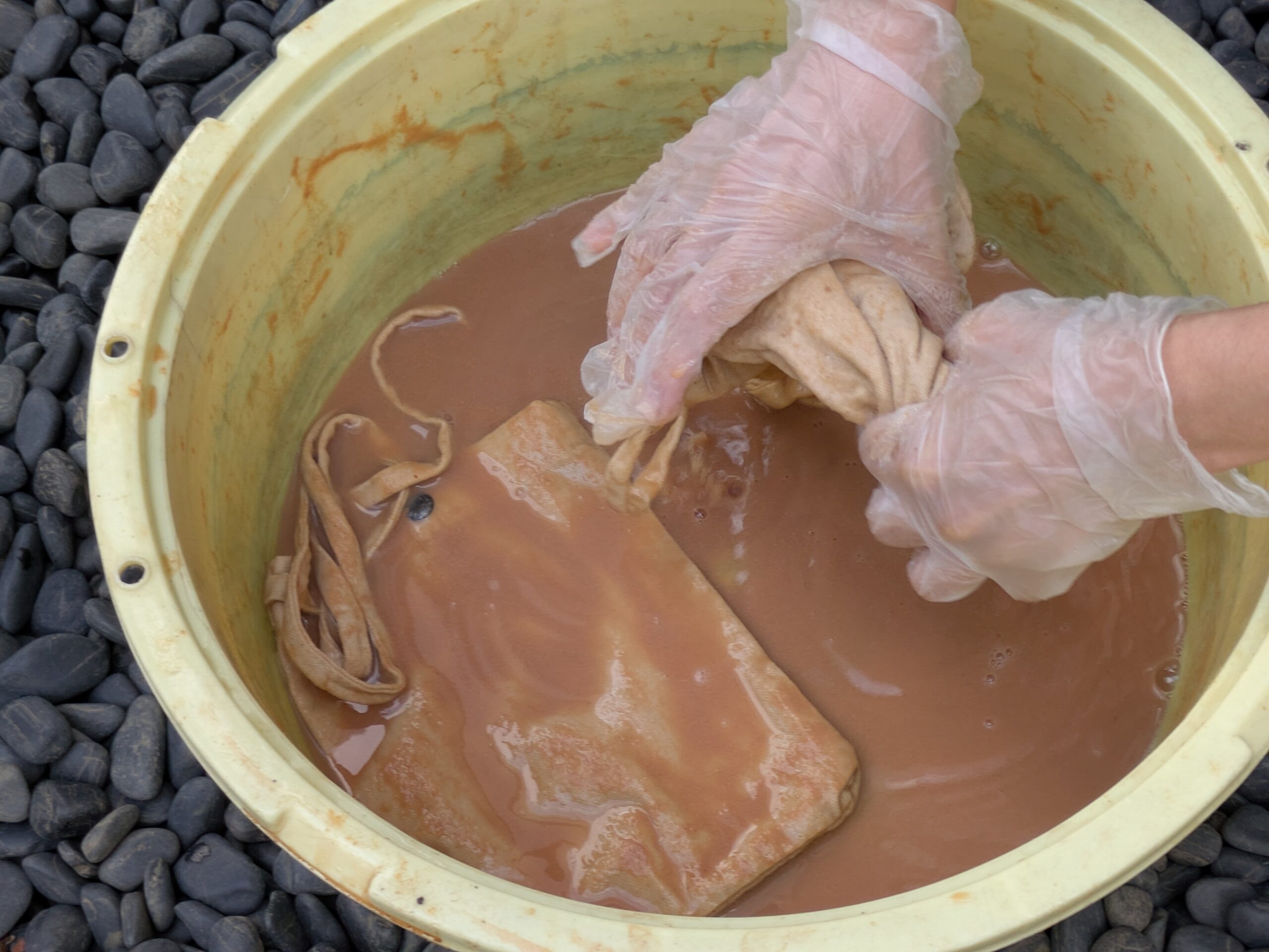 こちらは鉄媒染。柿渋液がついた布を浸したら薄い黄色だった液が真っ黒になっちゃいました。化学反応ですね。