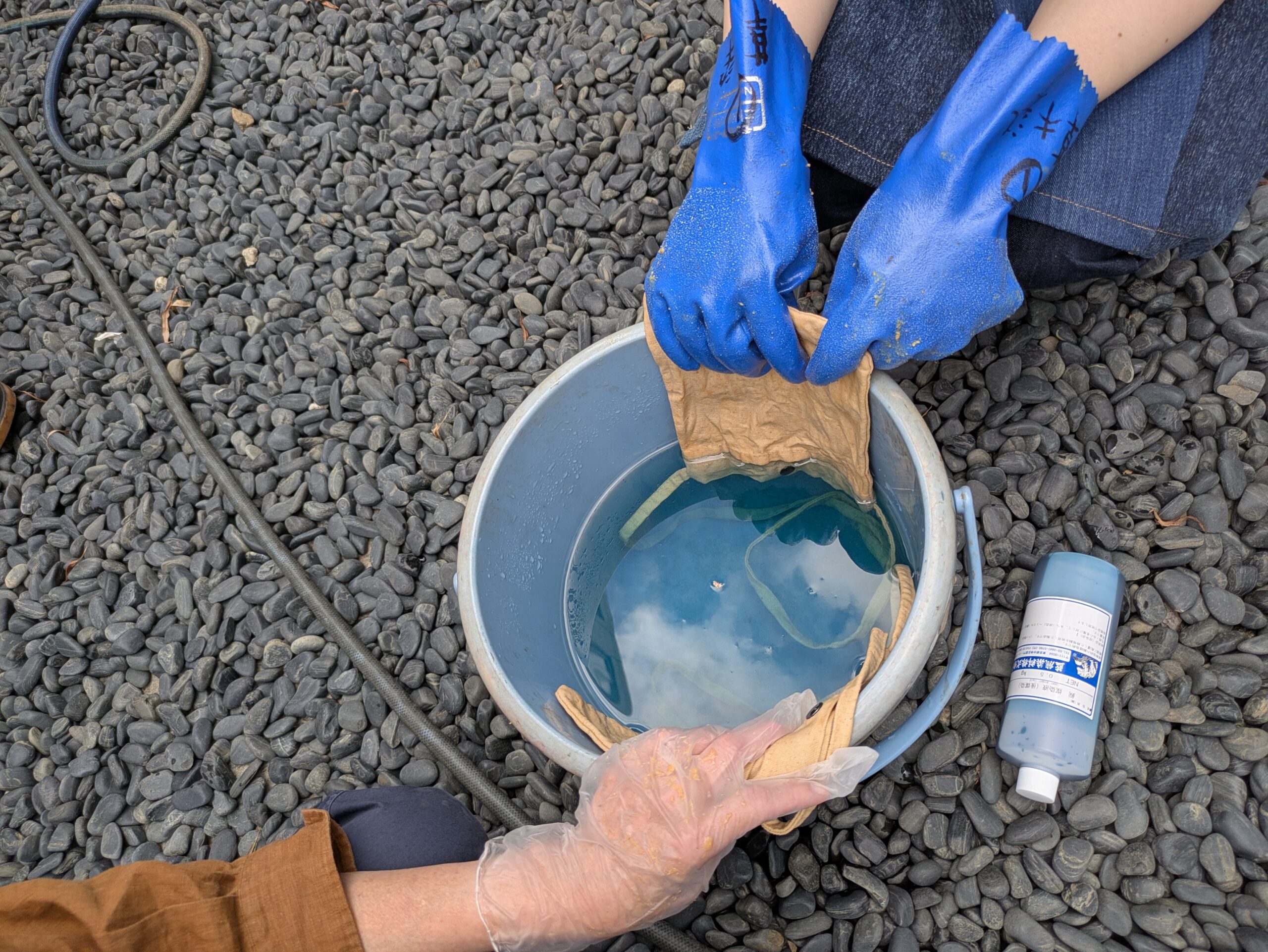 染料をしっかり揉みこみ、柿渋液を浸透させたら10分程置いておきます。