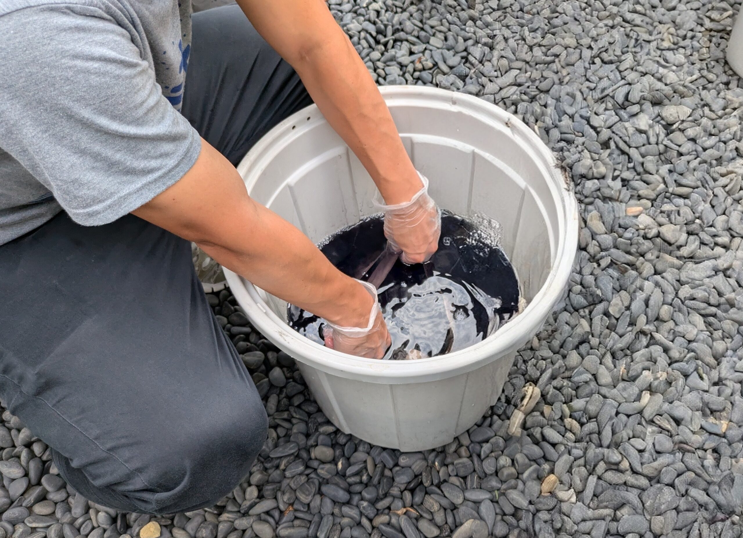 皆さんが先月作ったのはまだ熟成が若いので、今回は小川さんが仕込んだ10年ものの染料を使います。
