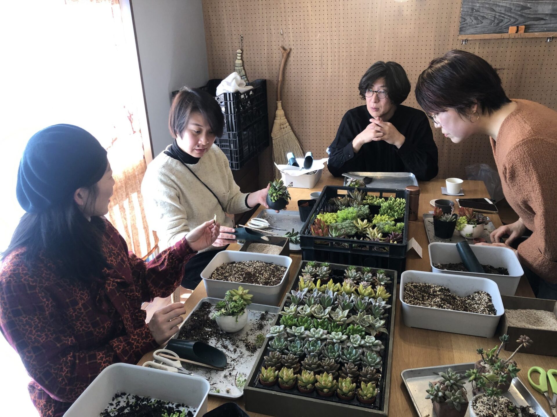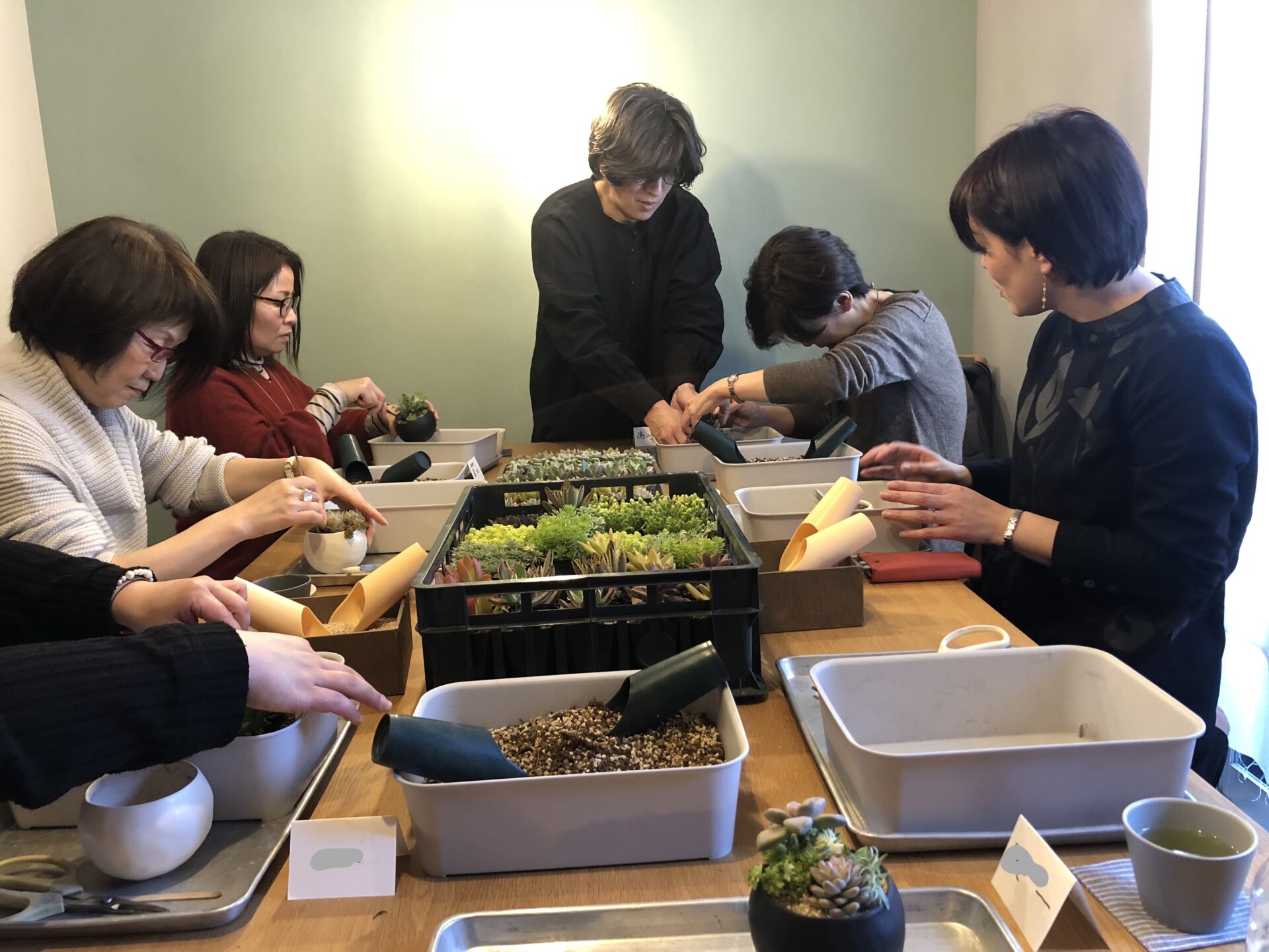 その後、思い思いに持ち寄った自分の多肉さんに、再度、別の苗を追加していく皆さん。たくさんの種類があって迷ってしまいそうですが、ご自身の世界観で思い思いに苗を足していきます。