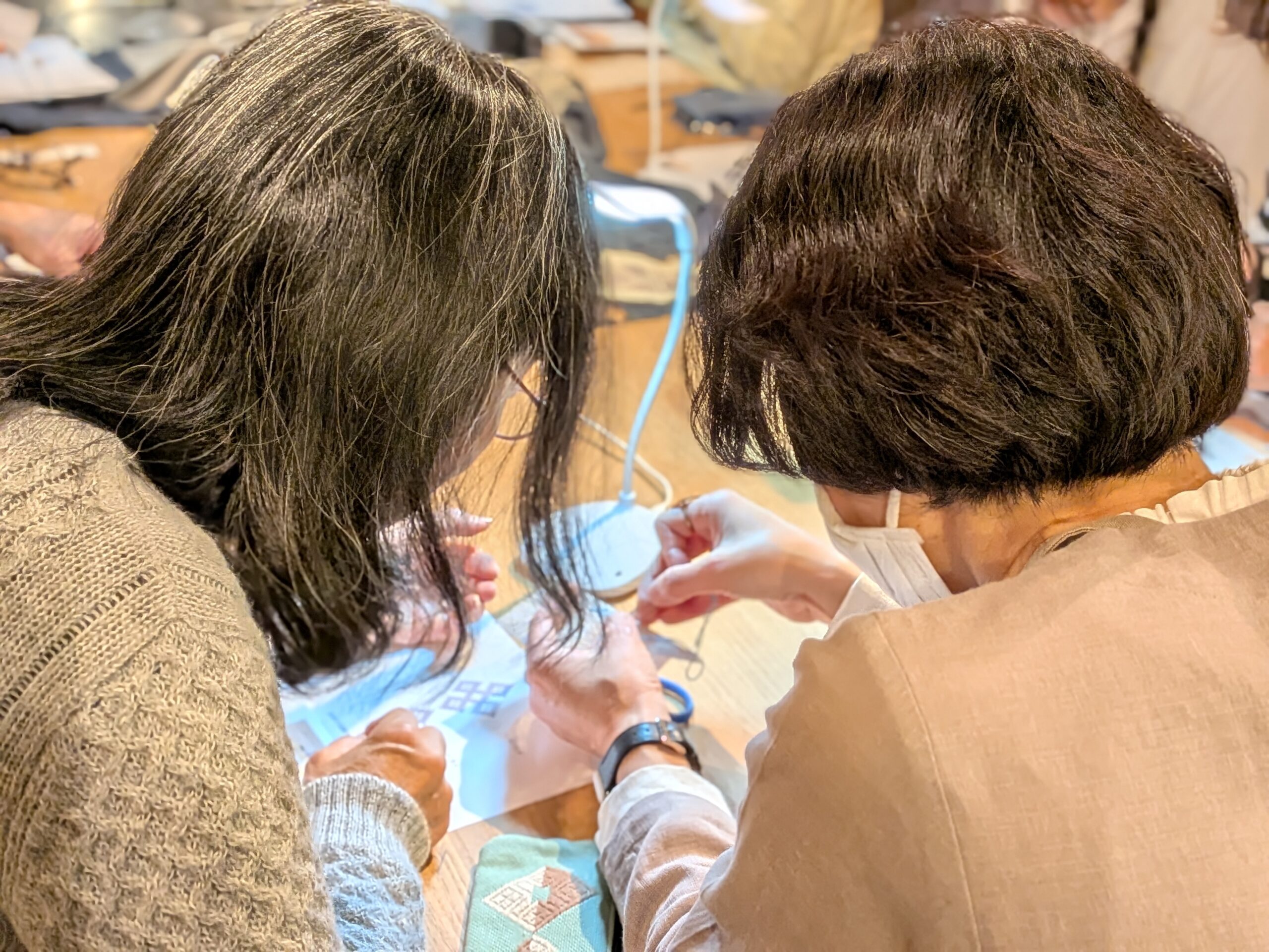 図案を見て、目の数を確認しながらチクチク。大きめといいながら、気づくと目の数を間違えていたり、、!「手元が明るく見えないとこれはなかなか難しいですね~」なんて話しながら、でも昔はもっと暗い環境の中でやっていたんだろうな、細かいところは見ずにほとんど手の感覚でやっていたのかな、、とかつての暮らしへ想像を膨らませました。