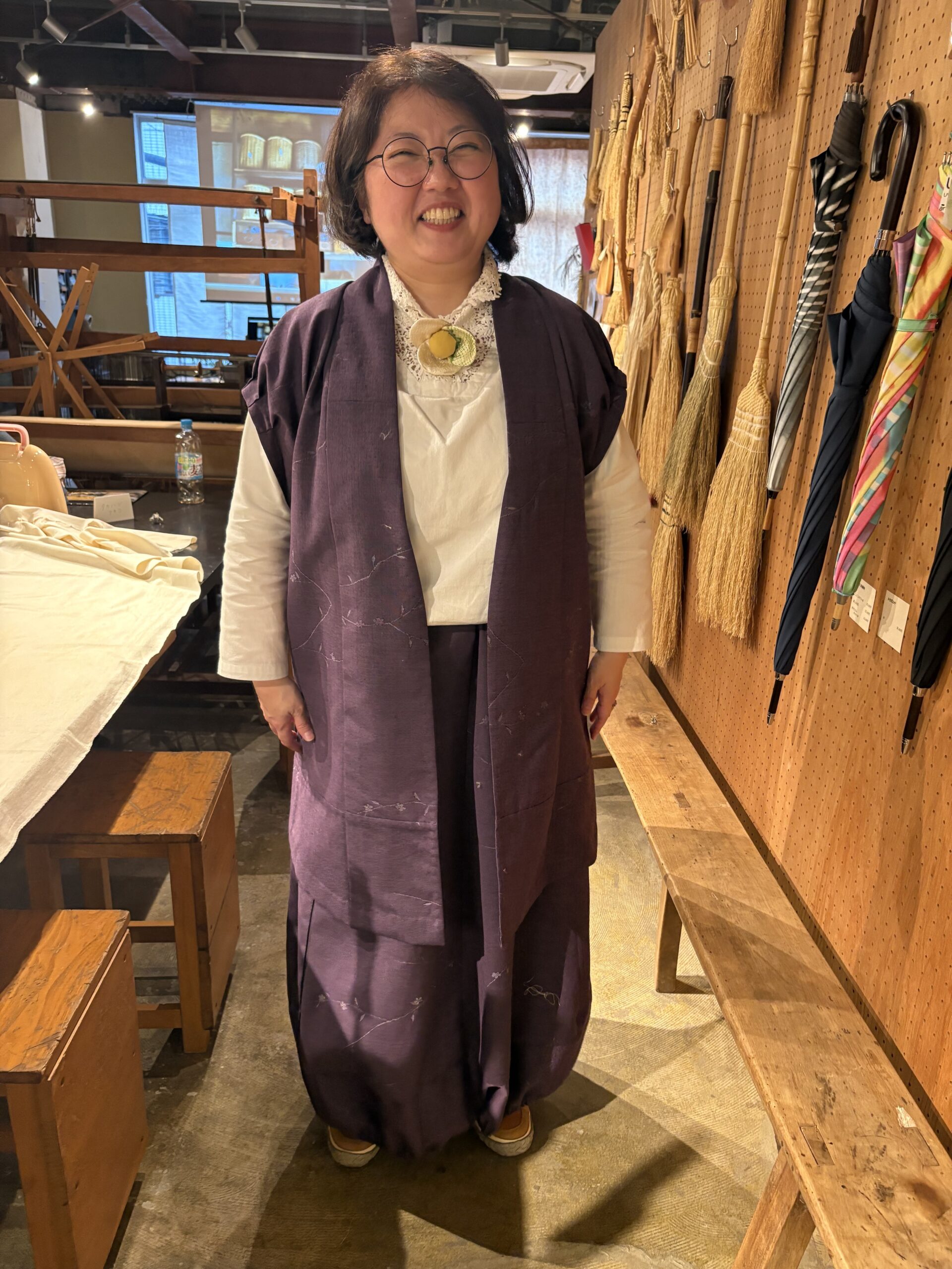教えてくれるのは、和裁教室でおなじみの土橋るみ先生。この日着て来てくれたのも、なんとるみ先生お手製の上下着物のリメイク!1枚の着物から作ったおしゃれなトップス、そして今回のワークショップでも作っているバルーンスカート。。とってもお似合いで、となりで行っていた別のワークショップの参加者さんにも呼び止められるほどでした♪