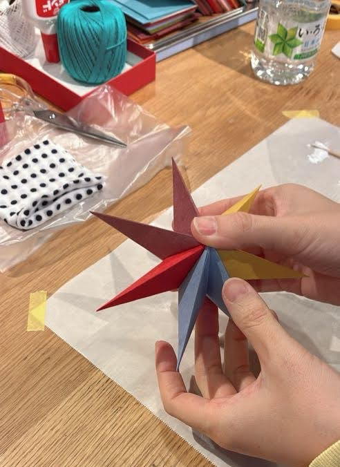 それでも先生が一つひとつ確認しながら進めてくださり、分からなくなってもすぐそばで教えてくれるので安心。星のかけらを折り、数がそろったら、ひとつにつなげていきます。