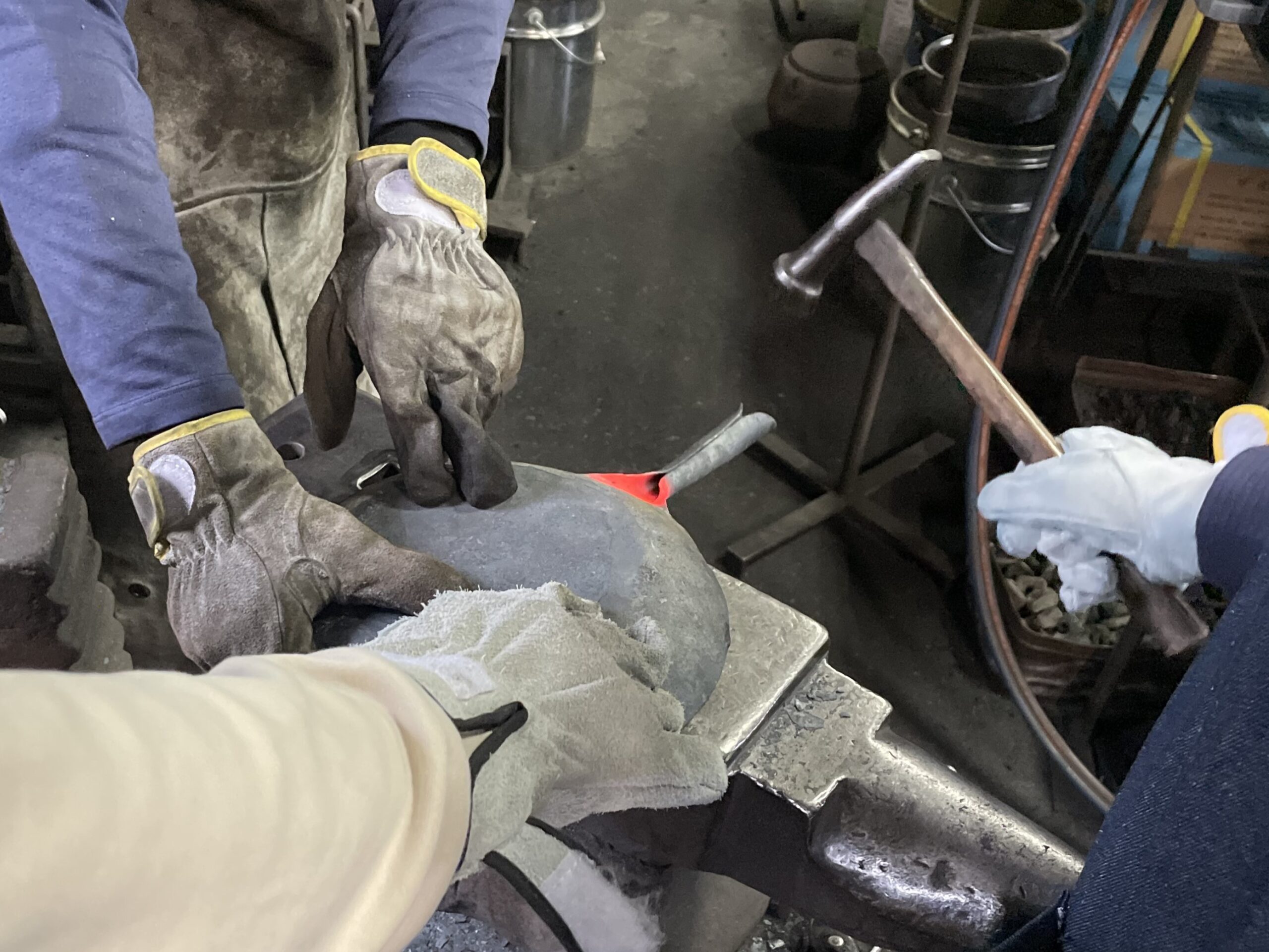 音も変わって、金属と金属のカンカン音!仕上げに向かっていく始まりのようにも聞こえます。まずは周りから叩いていきます。