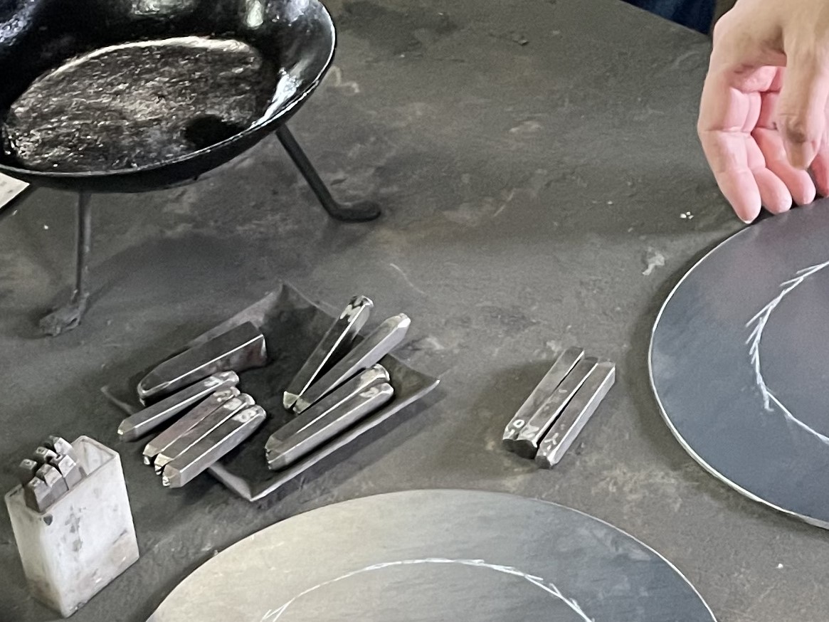 刻印を決めたら、金槌で打っていきます。簡単そうに見えて意外とグラグラして難しそう。