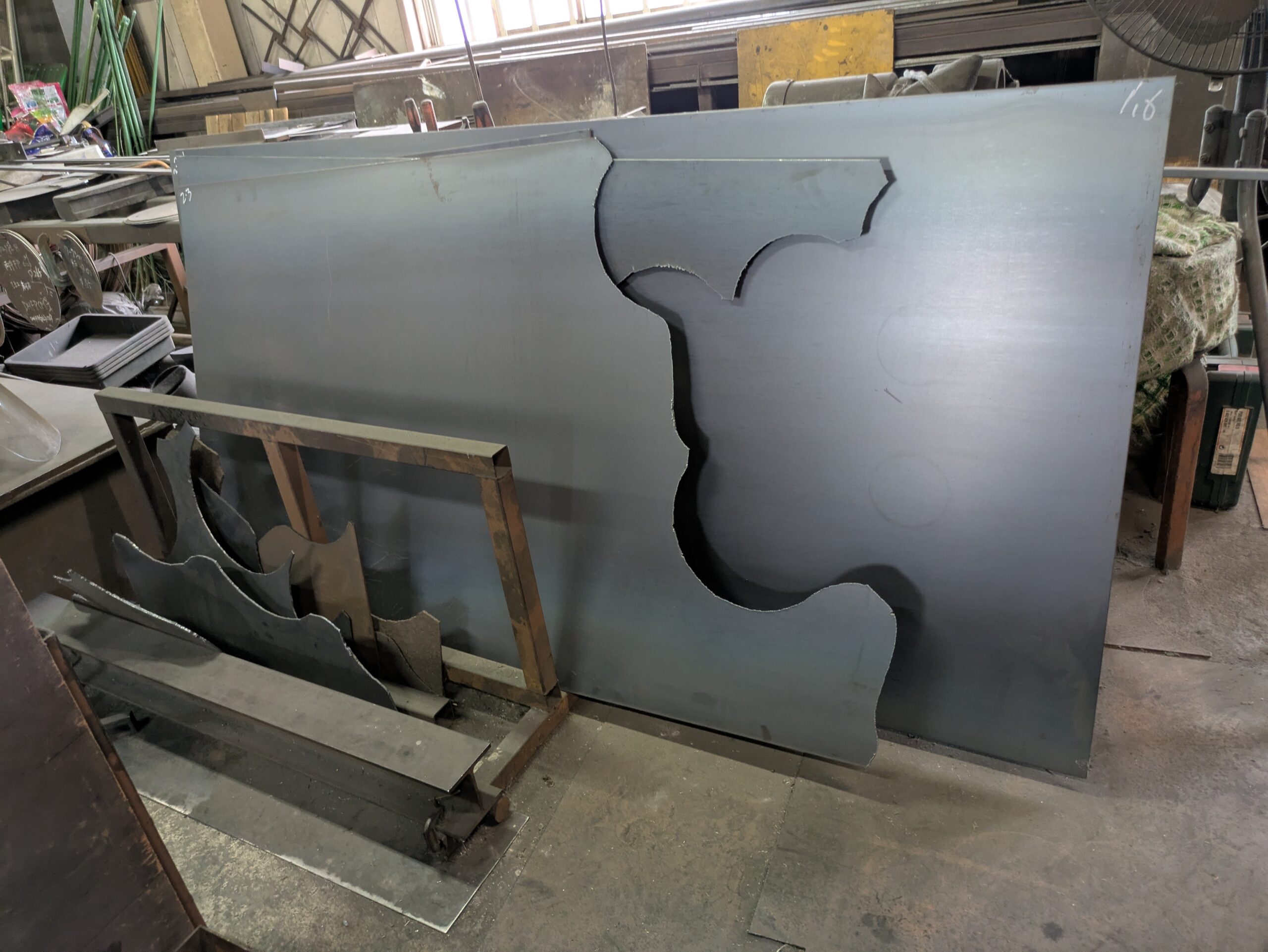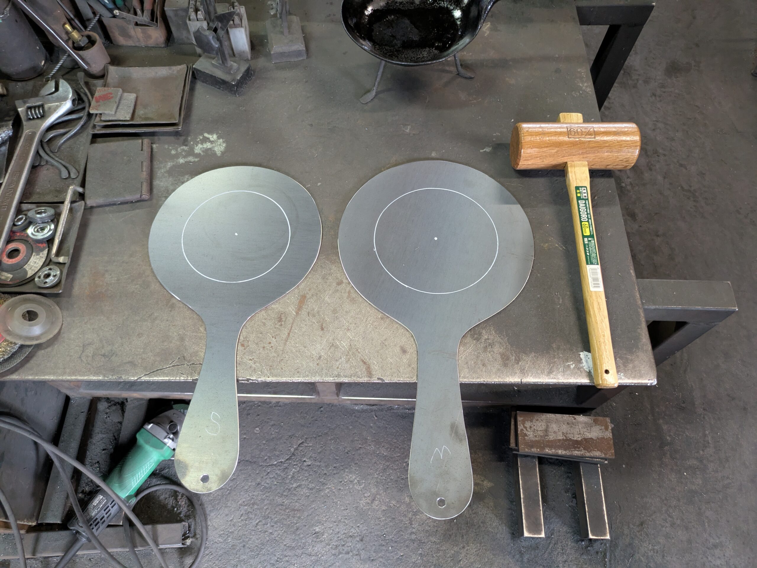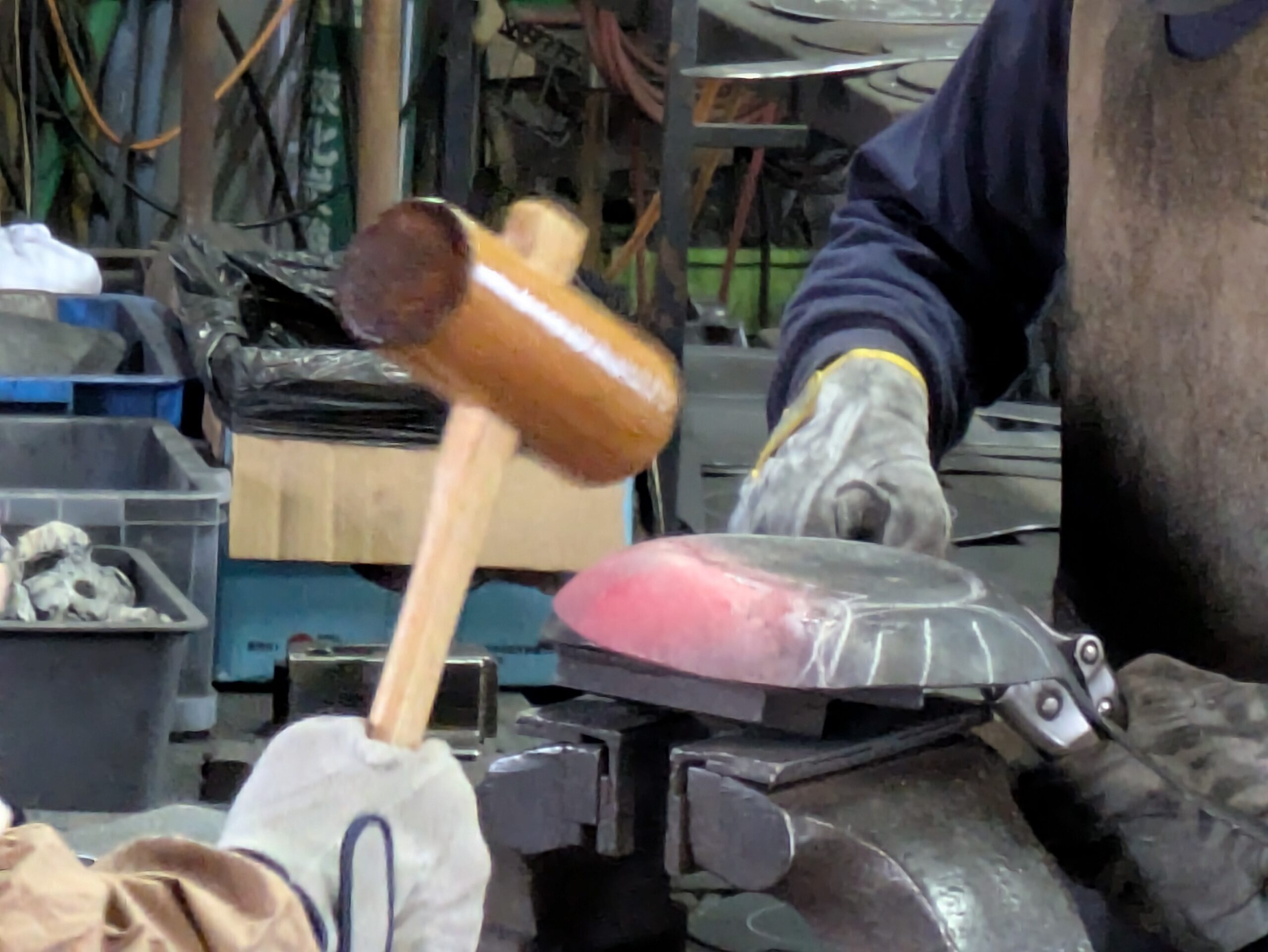 これから叩いてフライパンになる切り出した鉄板はこんな感じで控えてました。脇にある木槌で叩いていくんですよ。意外ですね!