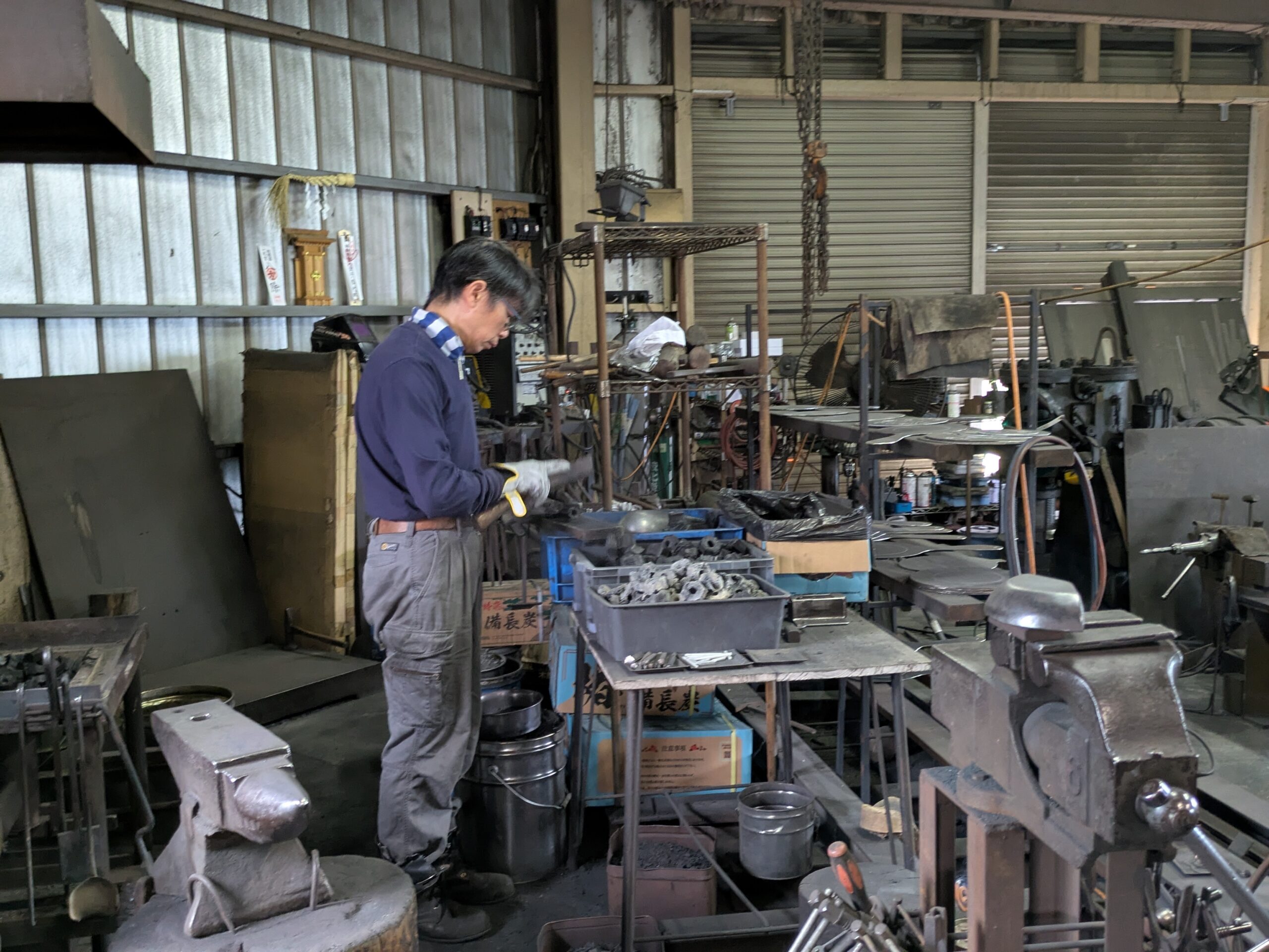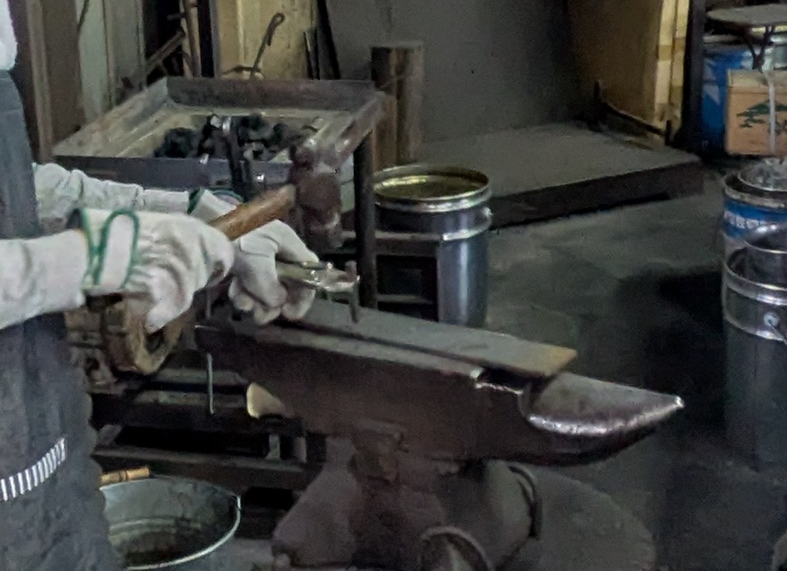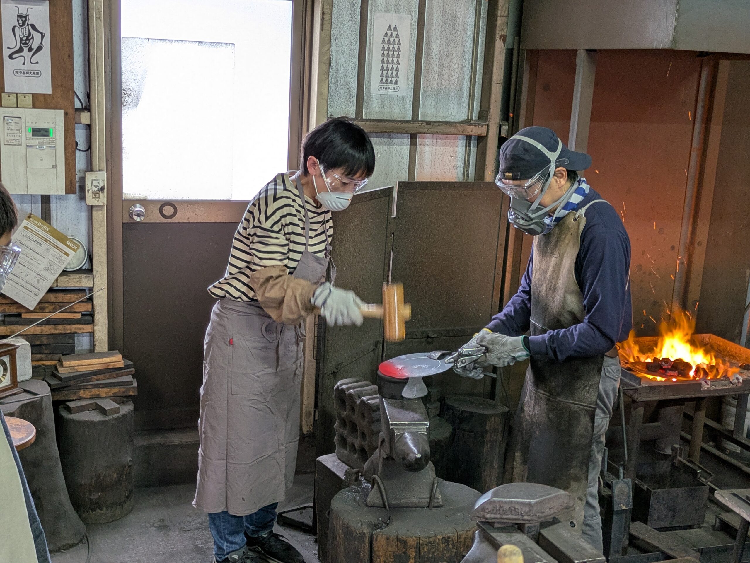 「余分な鉄を移動させるイメージで。」と金子さんのちょっとしたアドバイスに一同、「なるほどね~」と深く納得。木槌の叩く音も安定してきて軽快にカン!カン!と小気味よい音が鳴り響き、順調に進んでだいぶ形になってきました。ここで一旦、午前中の作業は終了。