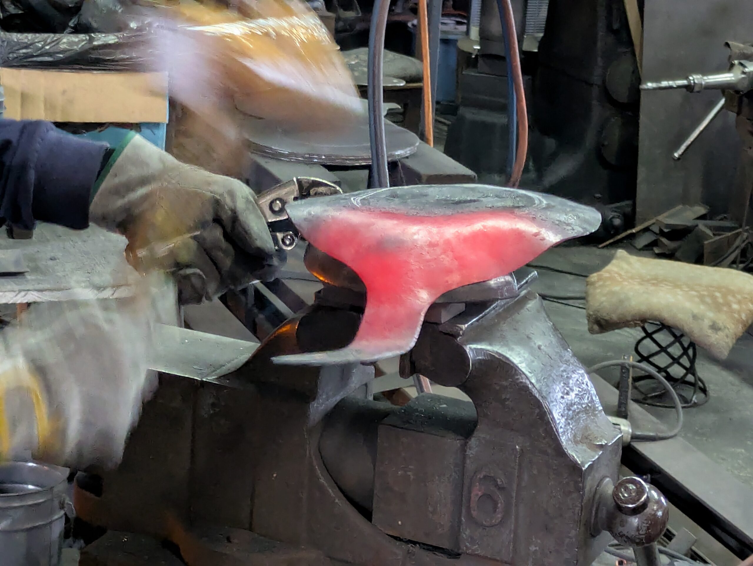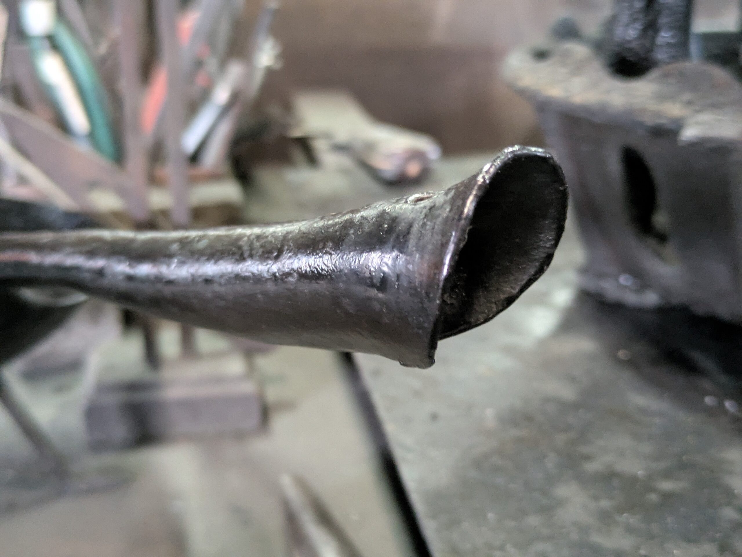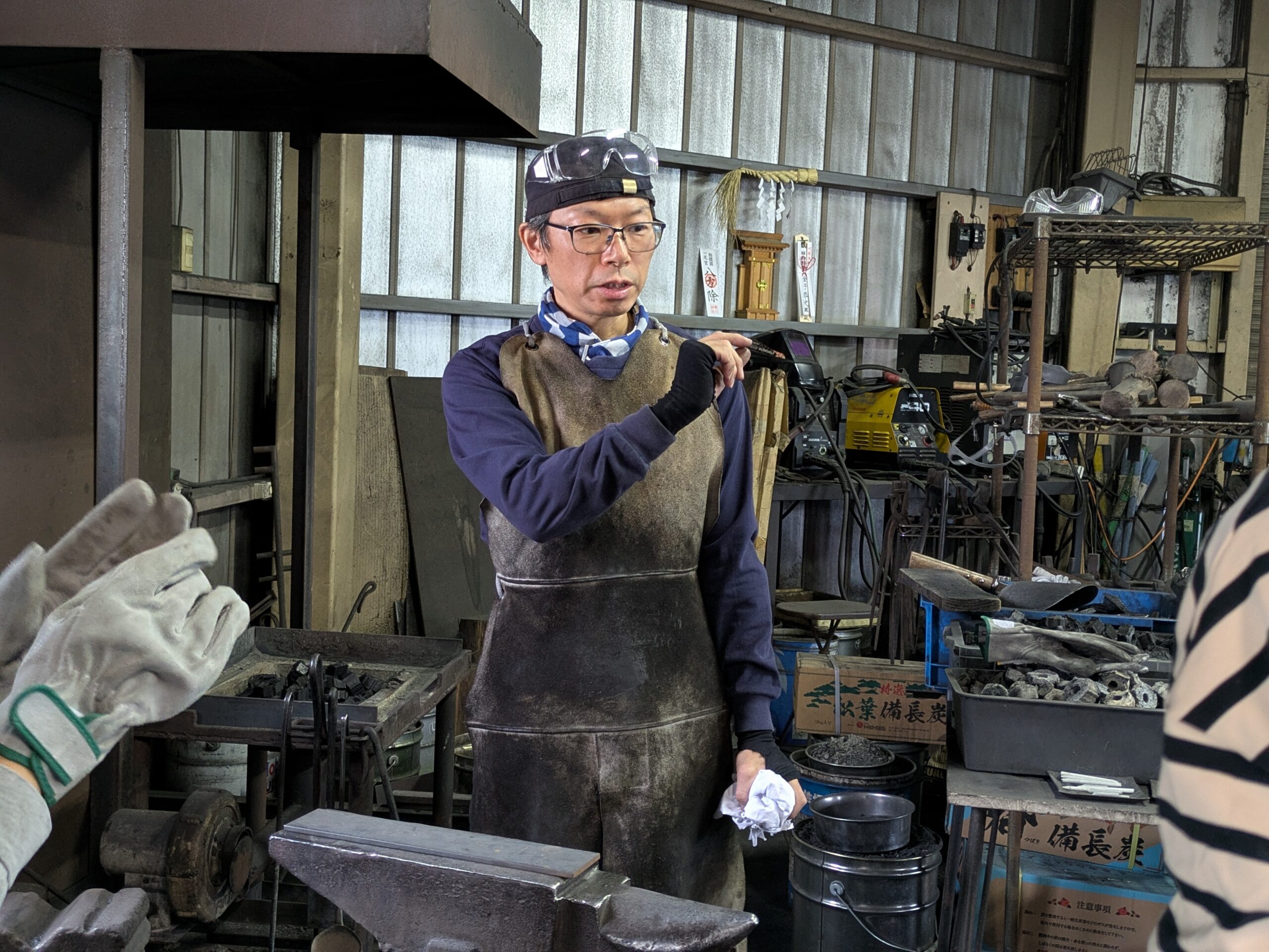 「余分な鉄を移動させるイメージで。」と金子さんのちょっとしたアドバイスに一同、「なるほどね~」と深く納得。木槌の叩く音も安定してきて軽快にカン!カン!と小気味よい音が鳴り響き、順調に進んでだいぶ形になってきました。ここで一旦、午前中の作業は終了。
