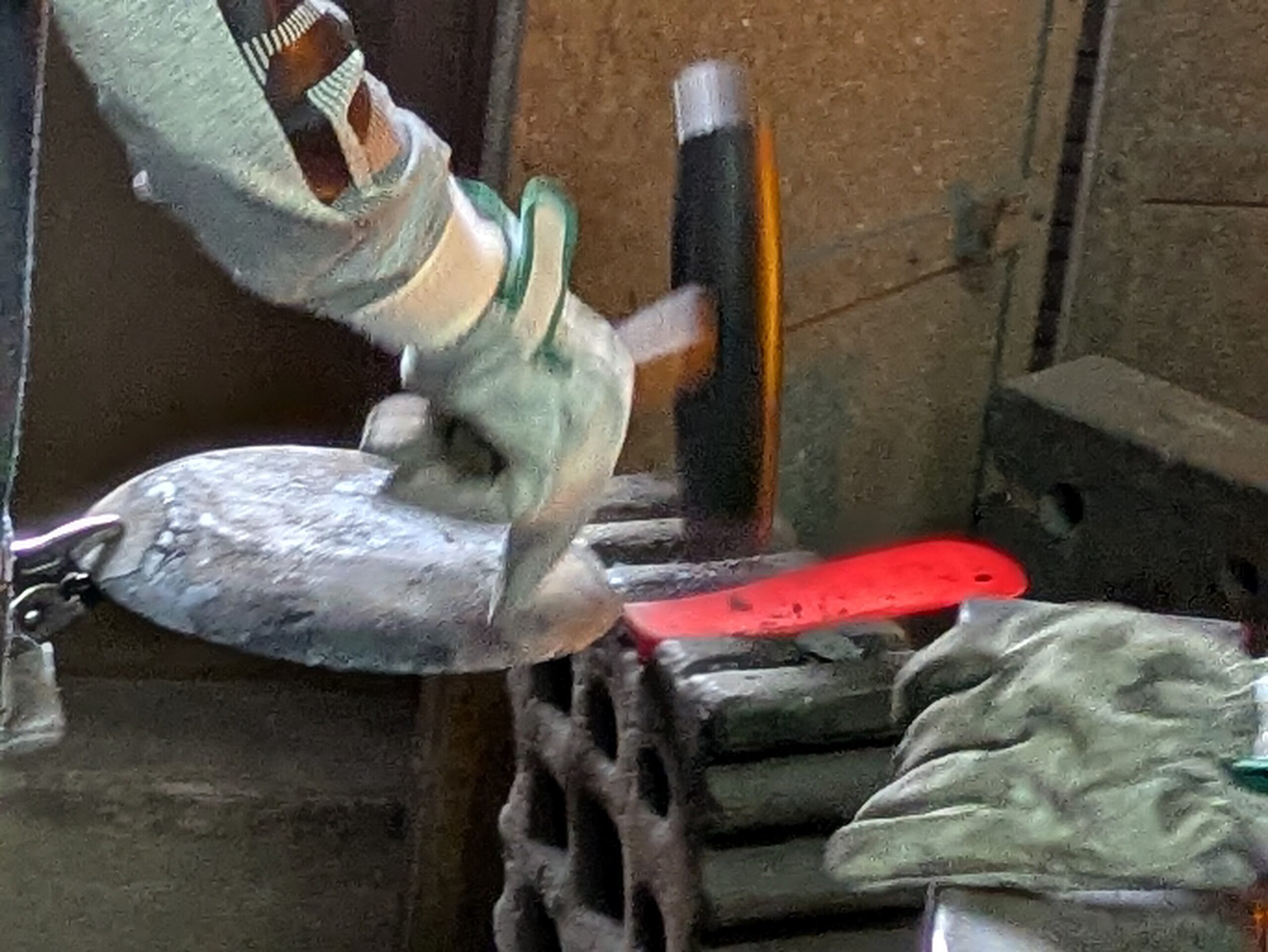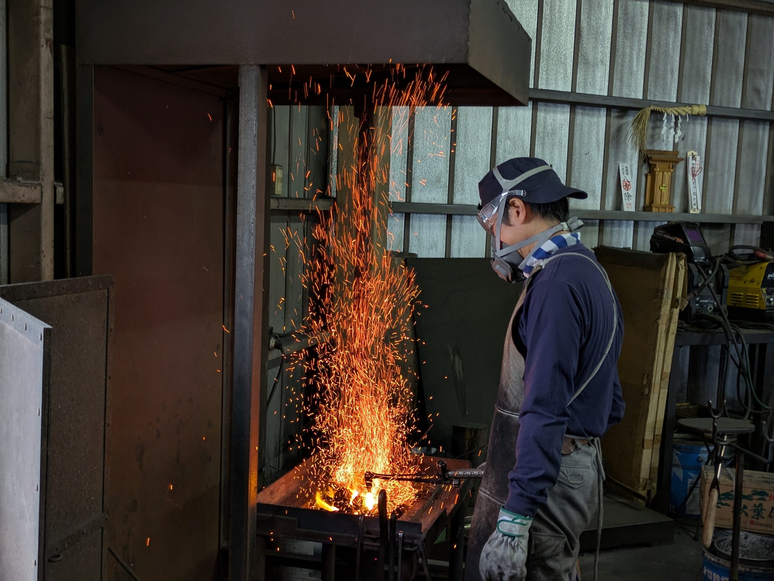 二組の参加者さんは熱しては叩く!熱しては叩く!の繰り返し。途中交代待ちのタイミングでお話しを伺うと、「意外と曲がる!」「楽しい!」とまだまだ余裕のコメント。