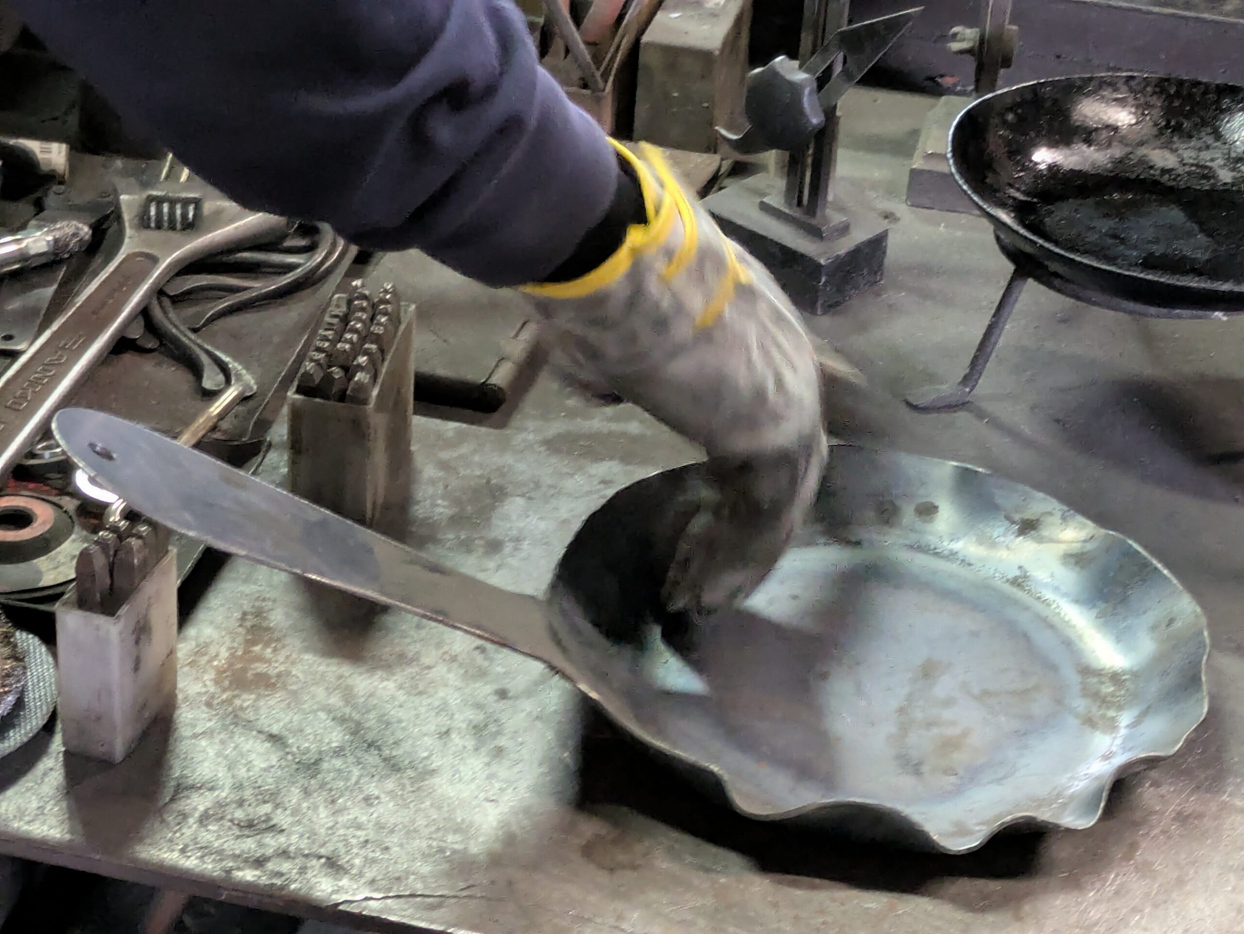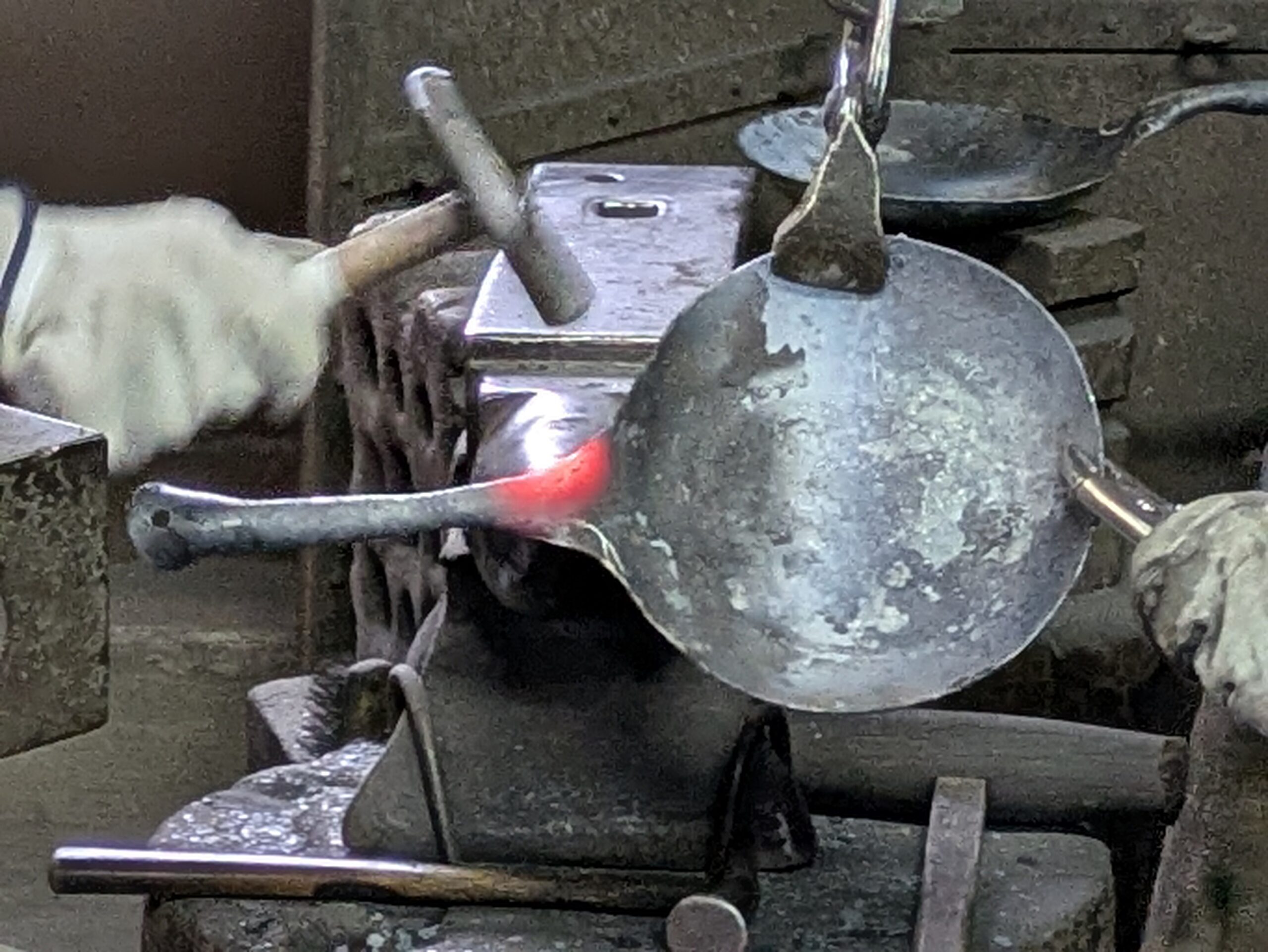 最後に、持ち手の加工です。ラッパのように少し広がった形の持ち手が特徴で、この広がりがあるおかげで握った時に滑って落ちるのを防いでくれるんだそうです。細かい所まで金子さんの気遣いが行き届いた素晴らしいフライパンです!
