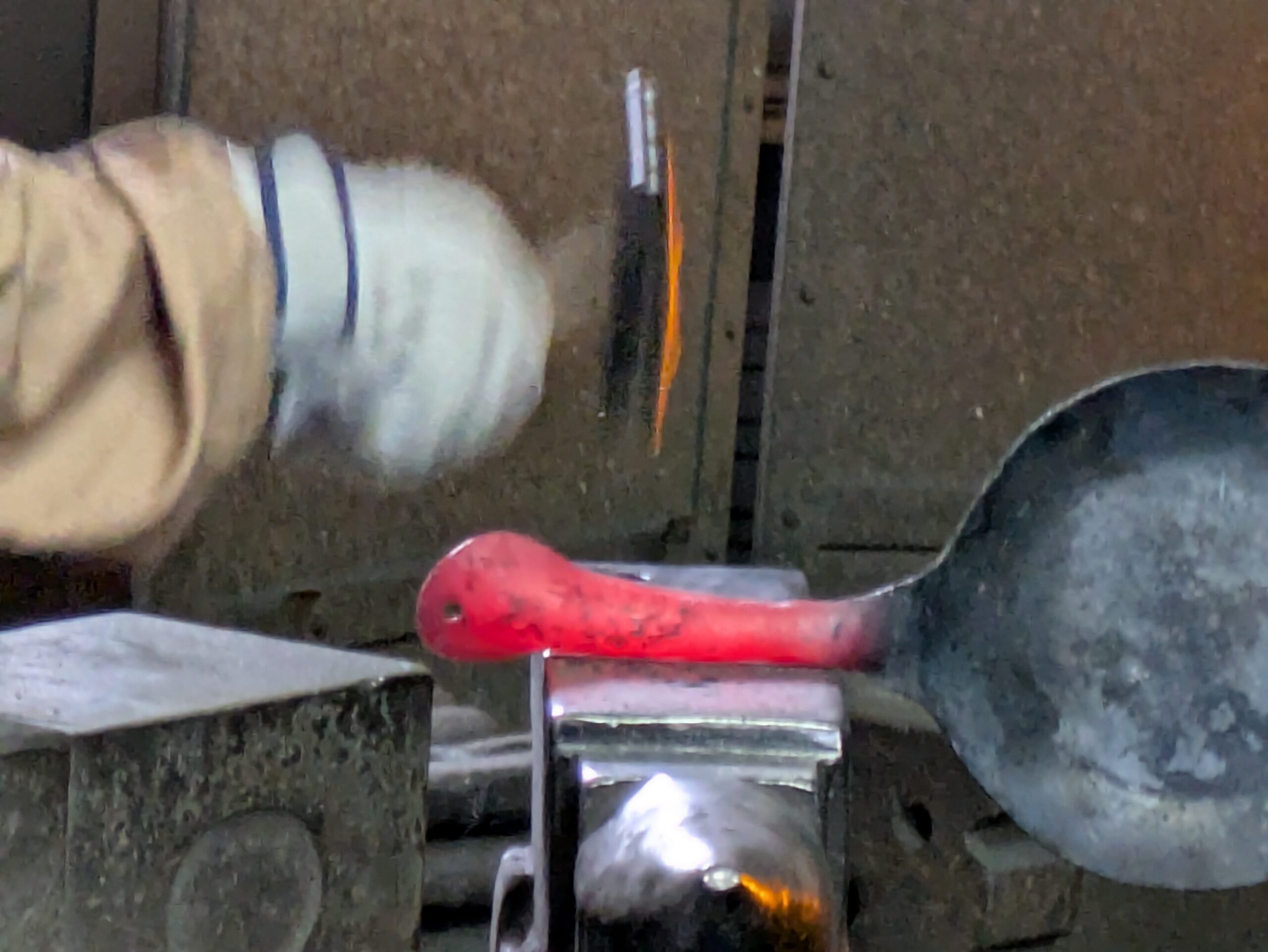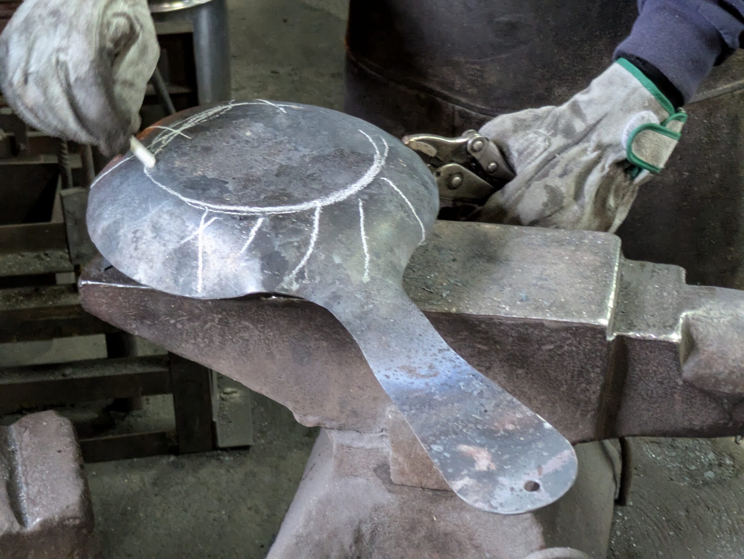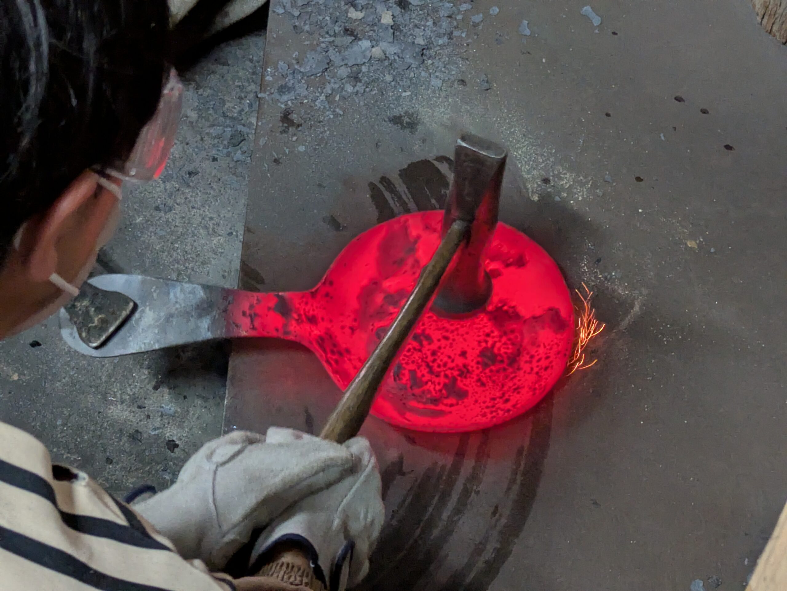 熱せられたフライパンが透明感を帯びてきたように見えます。周りの炎はなんとも妖艶な感じで引き込まれそう。最高に熱々になったところで、今度は金槌で底面を整えていきます。