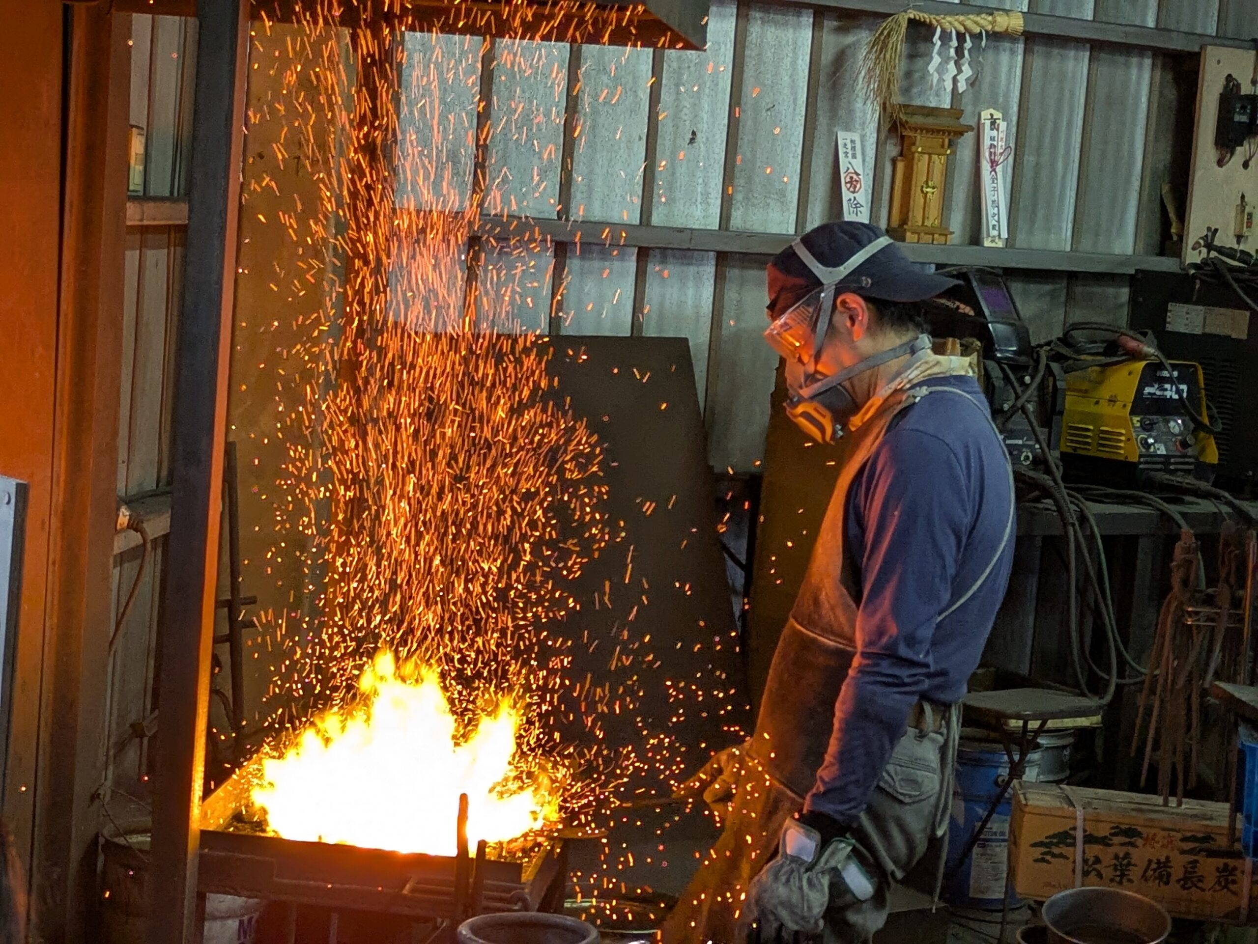 火の温度や鉄の状態を見極めながら、炭をくべていく金子さん。