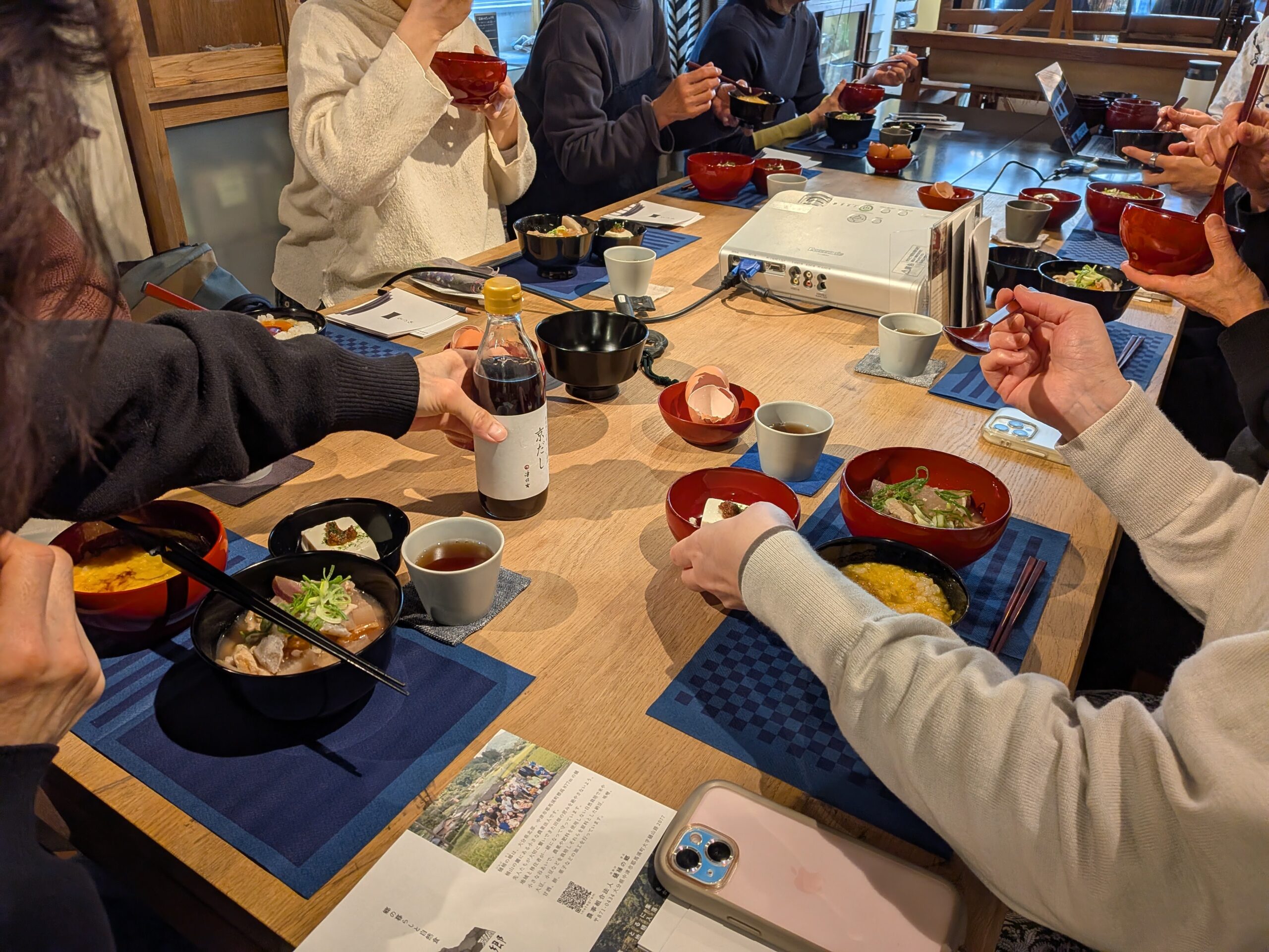 三つ組椀は、3種類の器「飯椀・汁椀・菜盛り椀」を一組にして、一汁一菜が完成します。今回は、ご飯と具だくさんの味噌汁、てならい堂の食品でおかずをつくり、みんなで食べました。