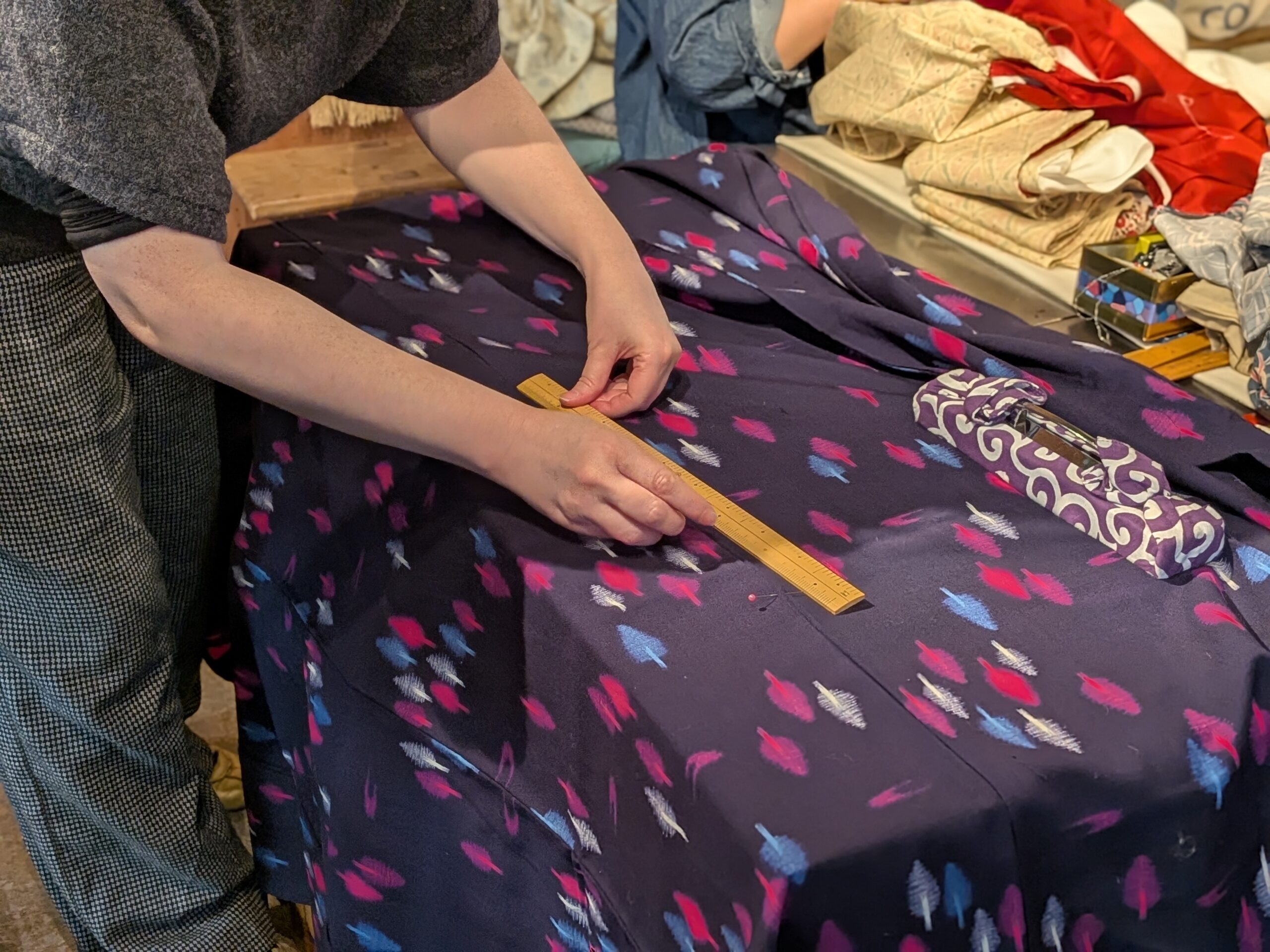 今回募集文に、「複数の着物を持ってきていただくのも大歓迎です!」と記載したので、みなさん3枚ずつくらいお持ちに!どれも個性があり、可愛いものばかり、、!!先生にそれぞれ素材を確認してもらい、ほどく作業に入りました。