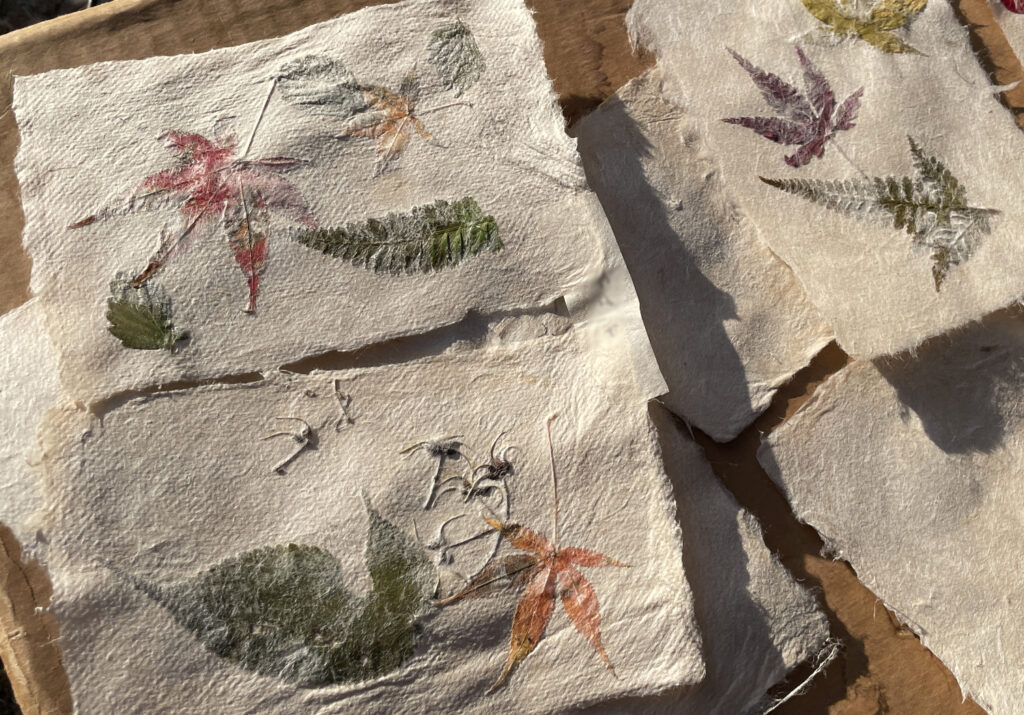 コウゾという紙の原料になる植物を切って、蒸して、皮(皮を使うんですよね)を剥いで、表面の不要な部分は削いで、乾かして、叩いて、とろろアオイと混ぜて、漉いて、水気をとって、乾燥するまで待って、完成!