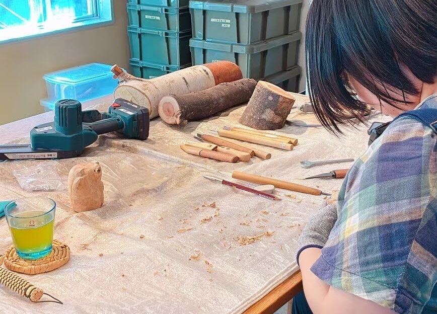 材料の木をたくさん持ち込んで、木彫りのくまを作ってます!