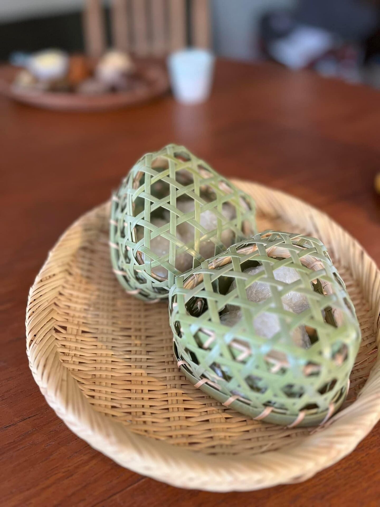 竹細工でつくるものは、ころんとしたシルエットがとってもキュートな”おにぎり籠 “。形はまる、さんかくから選べますよ。