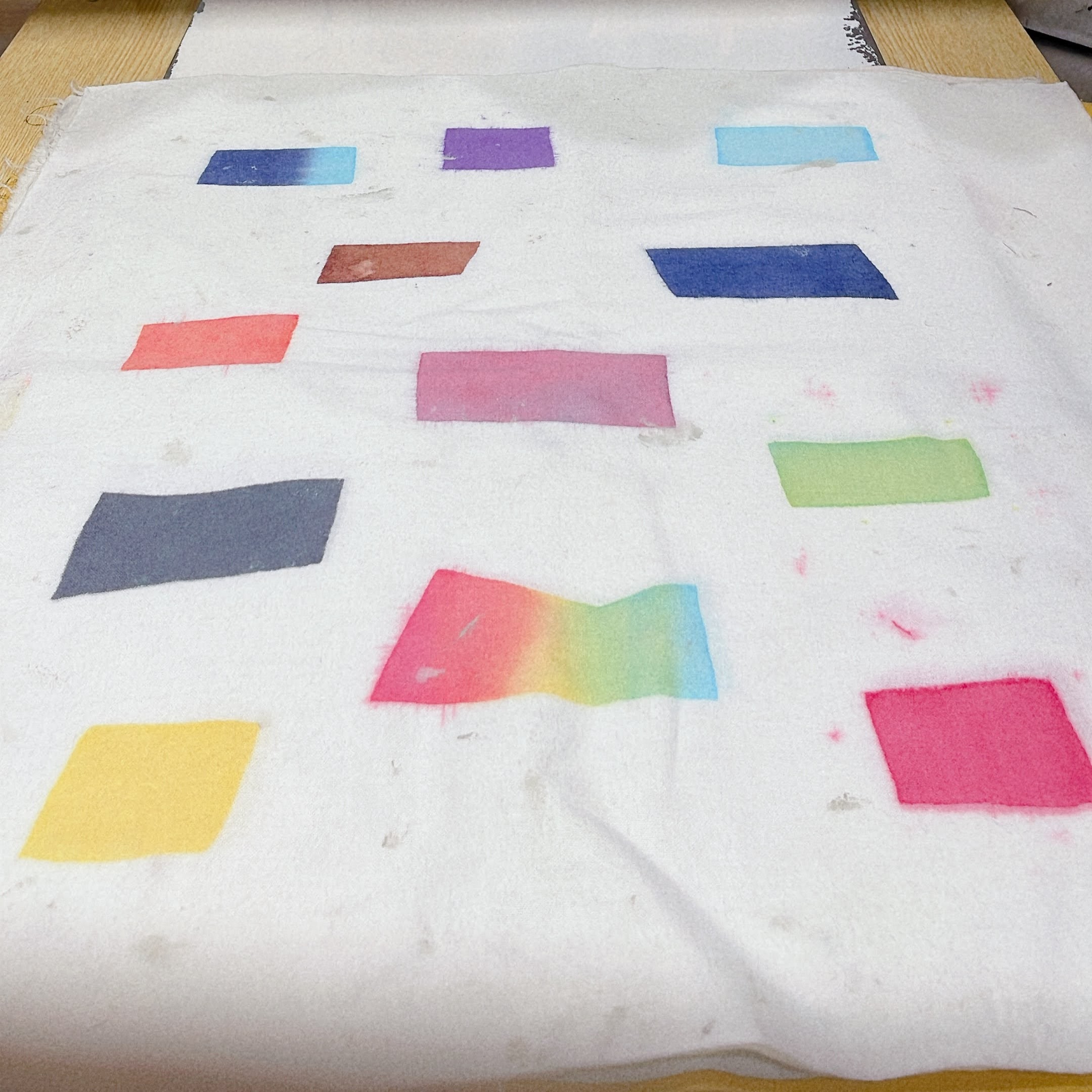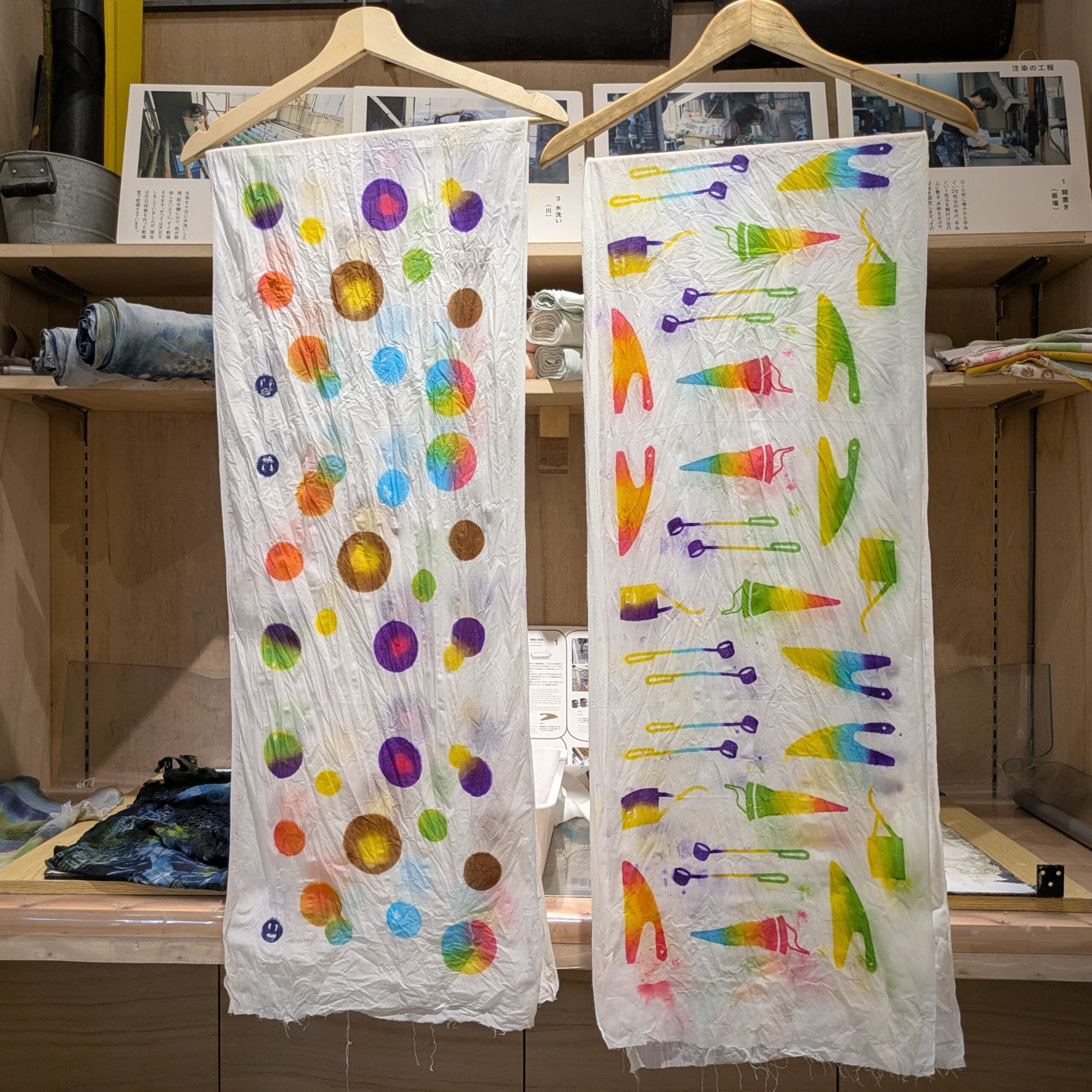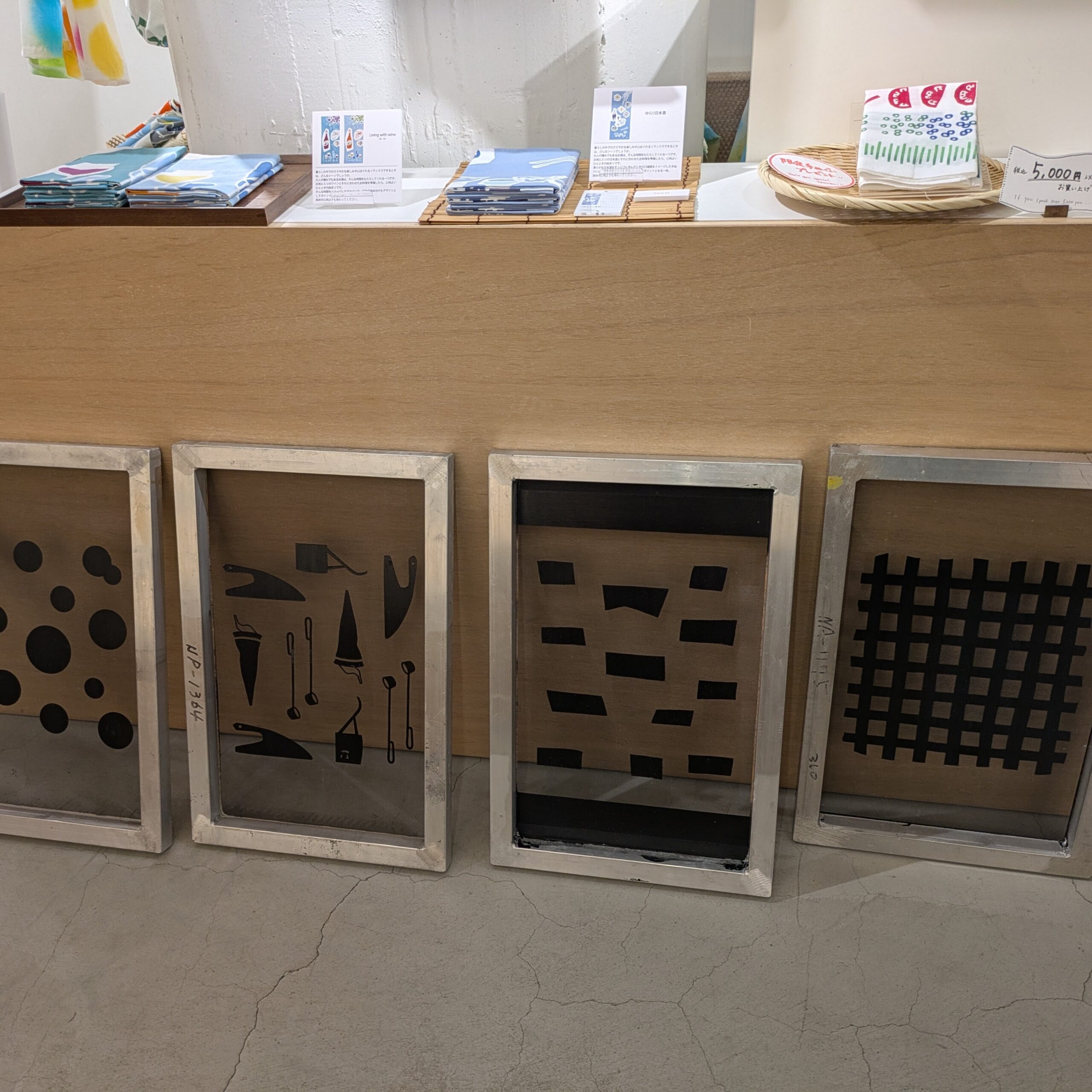 上野にある「注染手ぬぐいにじゆら 染めこうば東京店」素敵な注染の手ぬぐい商品を見つつ、奥に進むと体験スペースがあります。今回のフルコースでは、お好きな型を選んで、糊置き、染めと作業します。当日はにじゆらのスタッフさんが事前に染めた布巾サイズの手ぬぐいのお土産付きです。