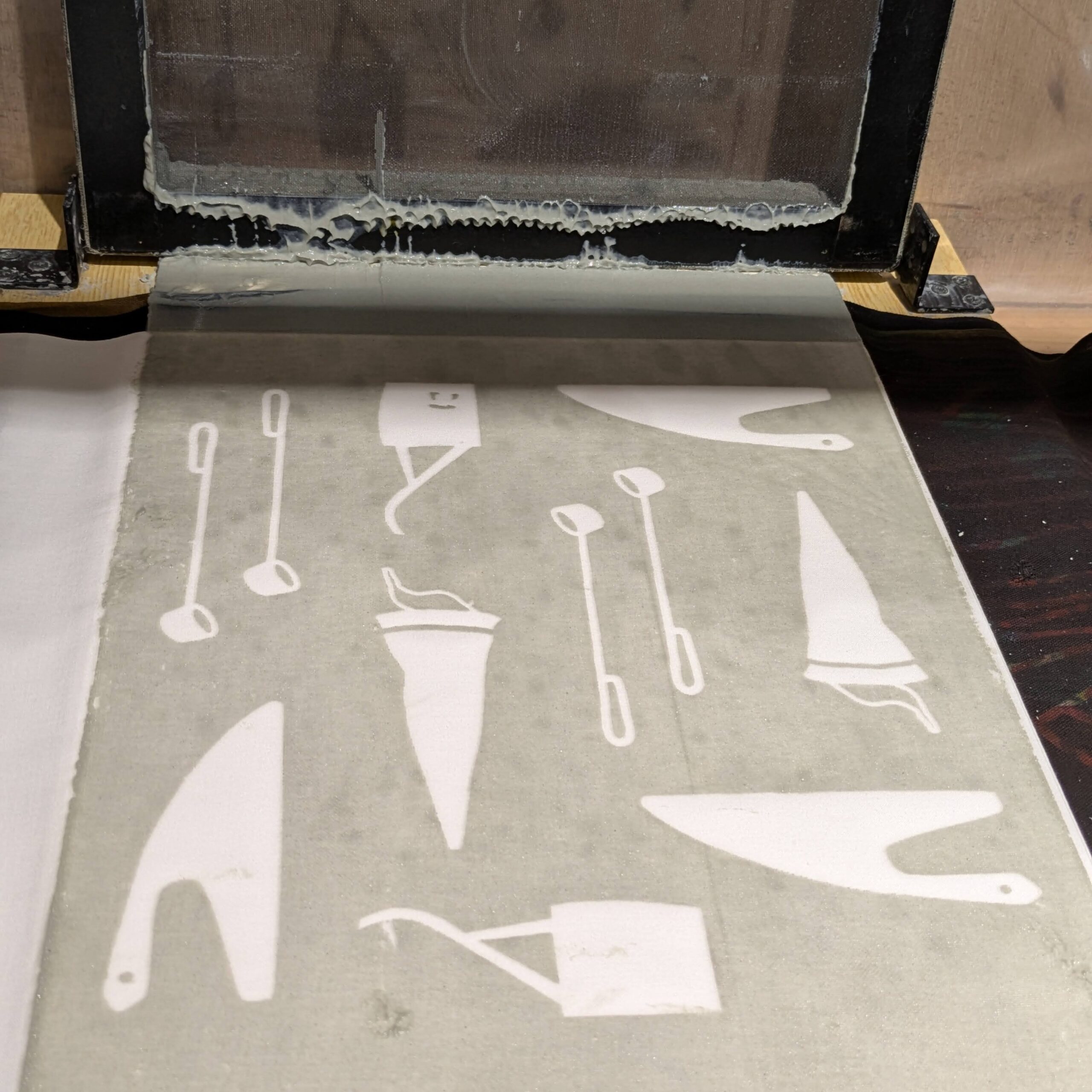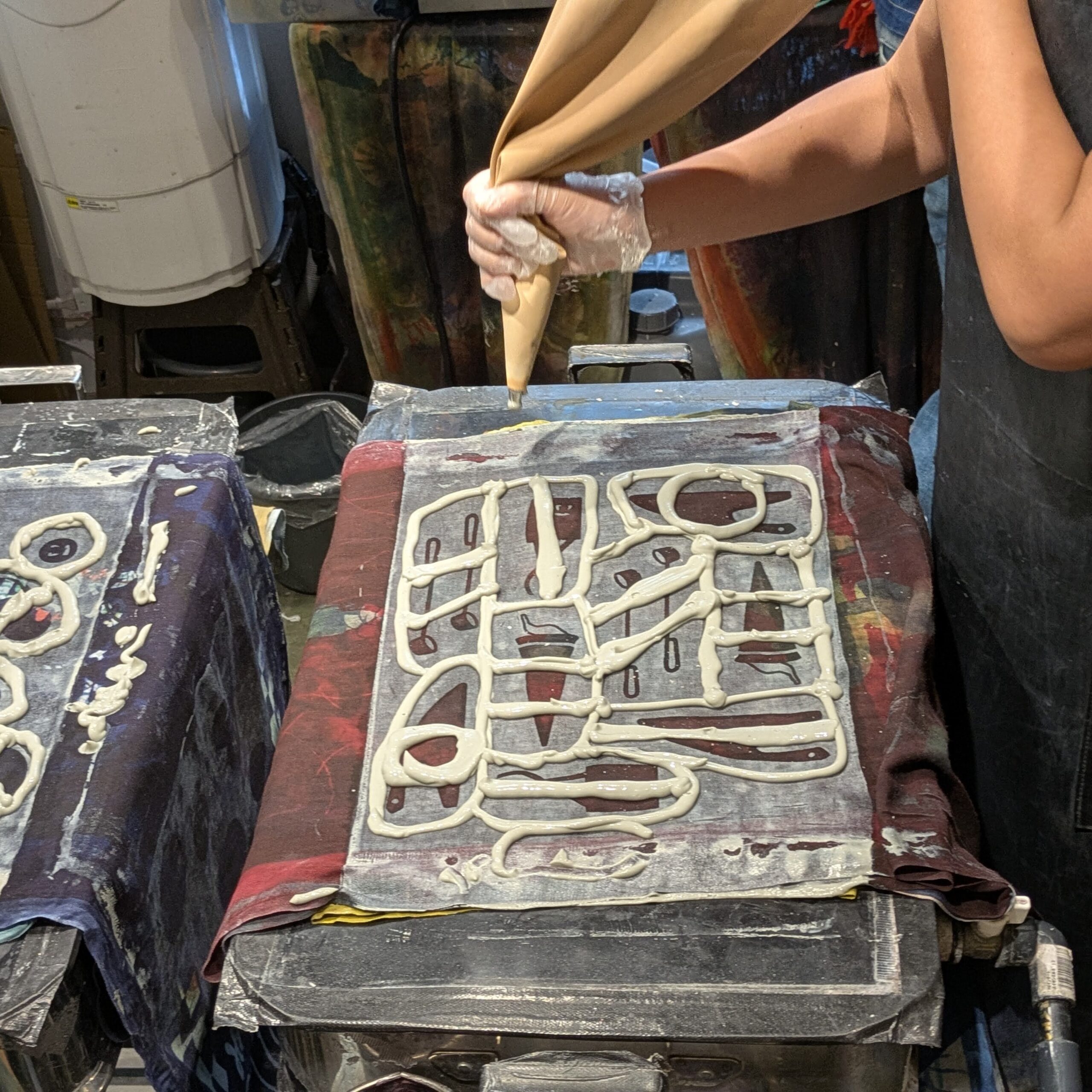染めも楽しいけれども糊置きも楽しいのが注染染め。染めない部分の防染糊の置く作業から、左官のようにさーっと均一にしっかりのせるのも楽しく技のいるポイント。更に、染めの色が混ざらないように土手を作るのがなかなかに難しくパズルゲームのようです。