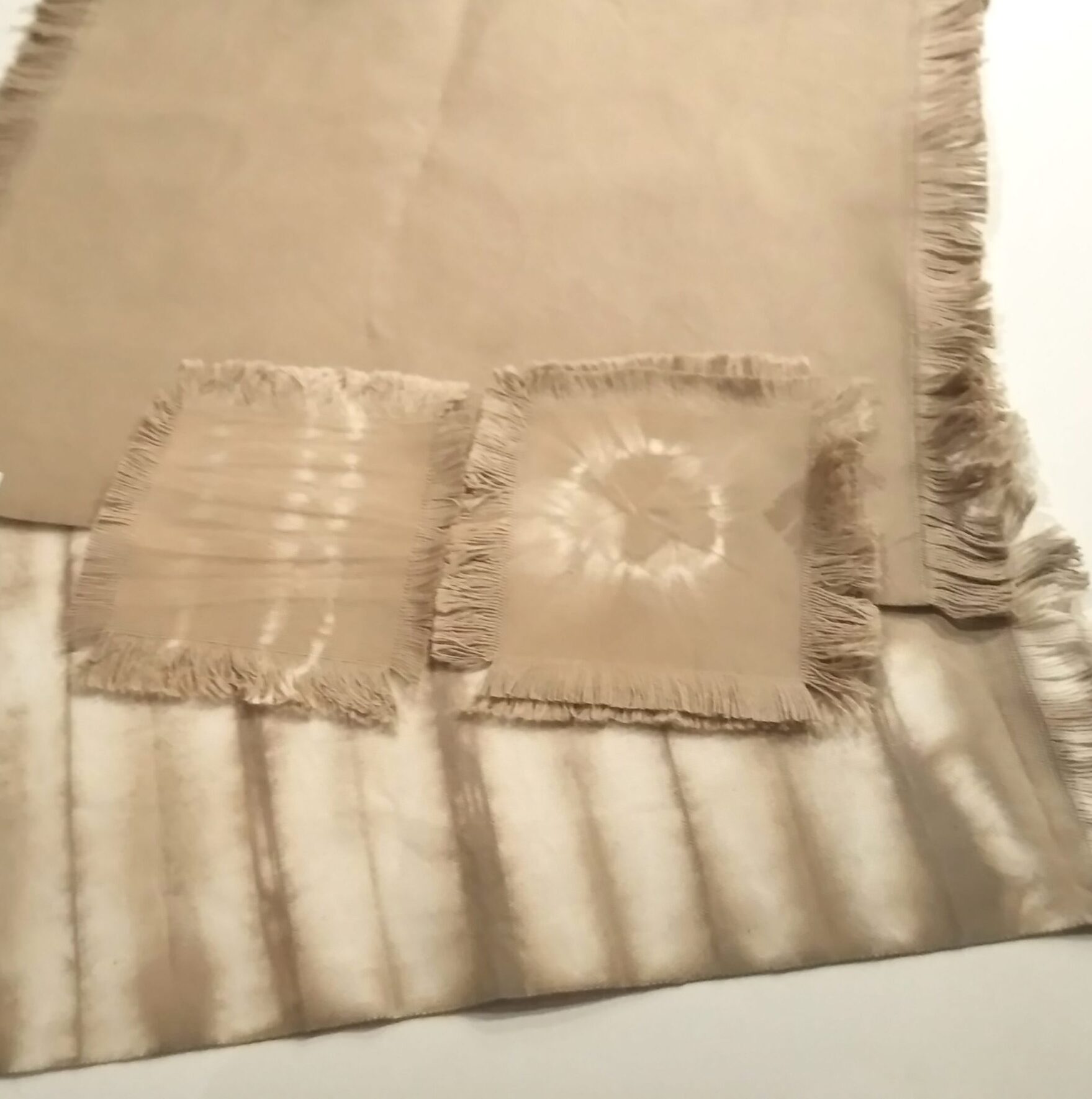 もちろんコーヒー染めでも、絞り染めや板締めで模様を付けることができます。シンプルにつまんで縛ったり、折ったり畳んだりして縛ったり、染色液に浸けない白い部分を残すことで柄をつくります。技法を駆使して、狙った通りに柄を出すのが結構難しいですが、それもまた『味』!ますます愛着がわきますね。