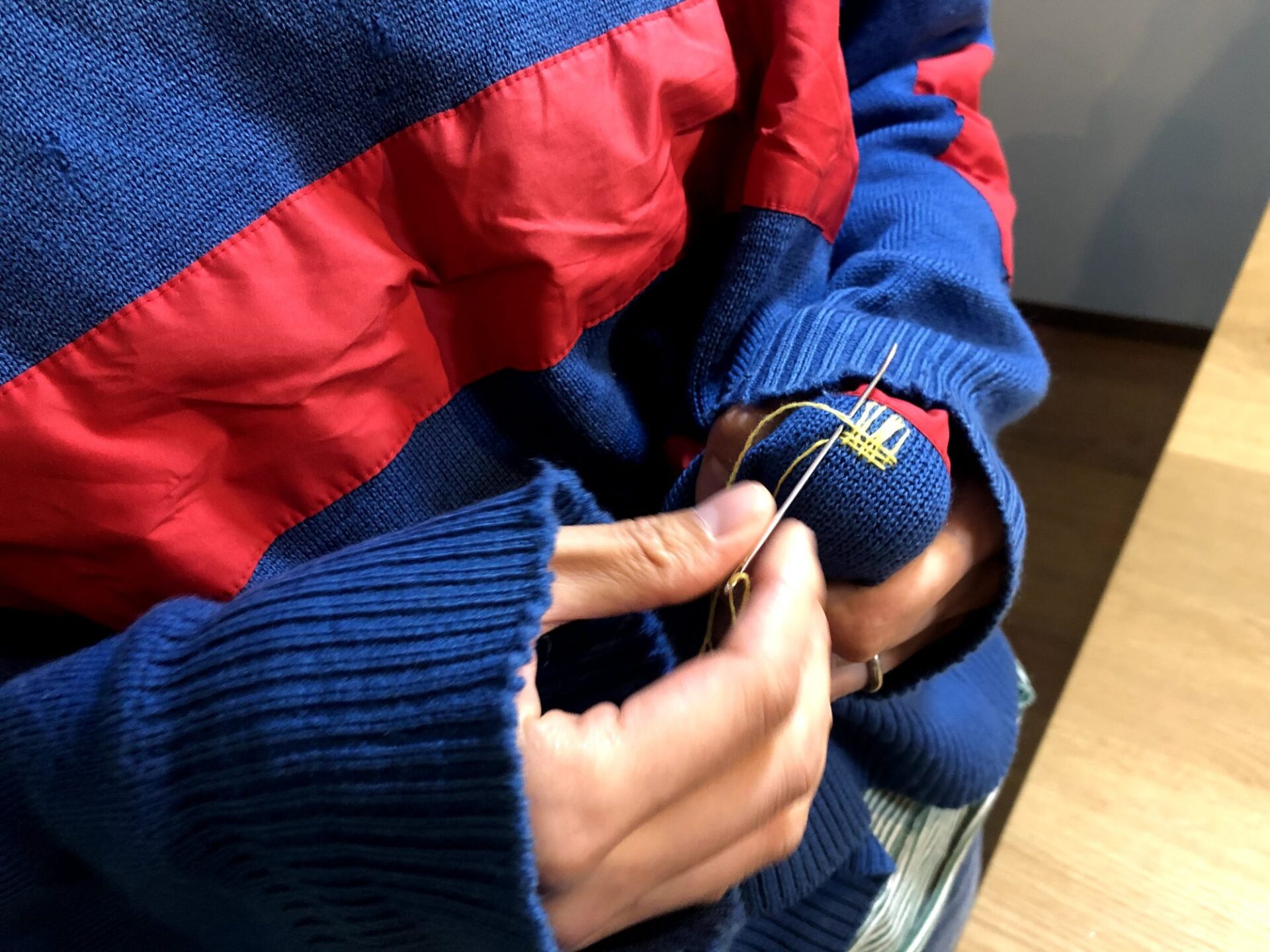 今回の教室はあくまで入り口。こちらで練習用の生地を最初は用意しますので、小さな穴や、端っこで練習してみて、大事なもので本当に直したいものはあとでじっくりやってみるのをおすすめしますよ。
