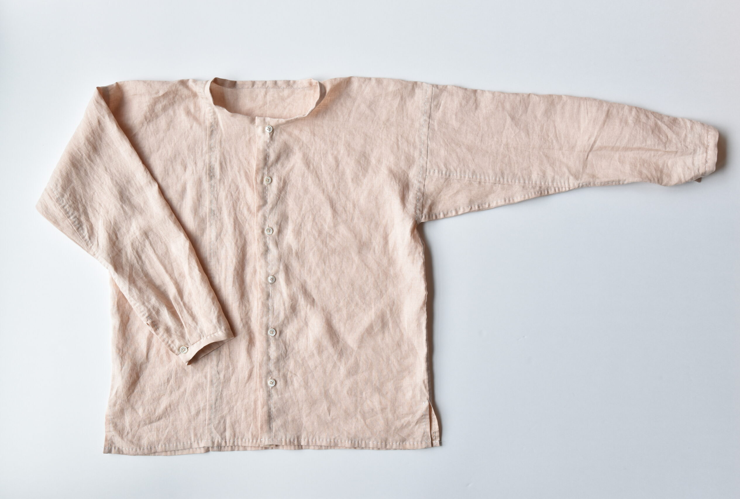石徹白でつくられてきた男性の作業着を現代風にアレンジした、和洋折衷の前ボタンシャツです。和服の延長なので、脇に三角形のマチがついているのが特徴です。着物のように肩線が落ちているので、どのような肩幅の方でも気にせず着られ、肩周りが自由で心地よく着れます。