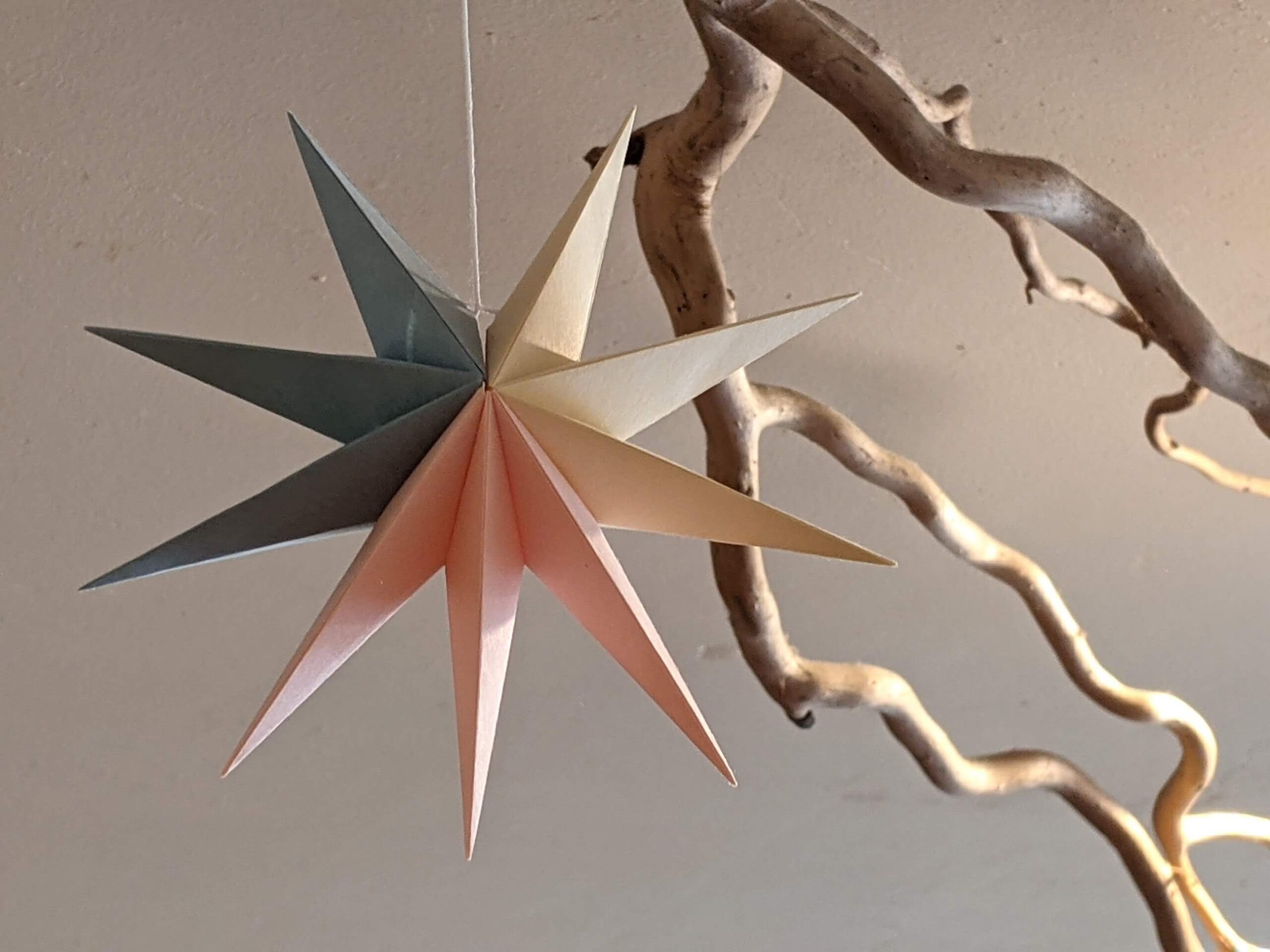 Folding Starの中心となる折り紙の星もある日、星型の照明を見ながら「あの形を自分でつくれないかなー」と思ったのがきっかけで、そこから折り紙と糊を使って、この星を作り出したそうです。