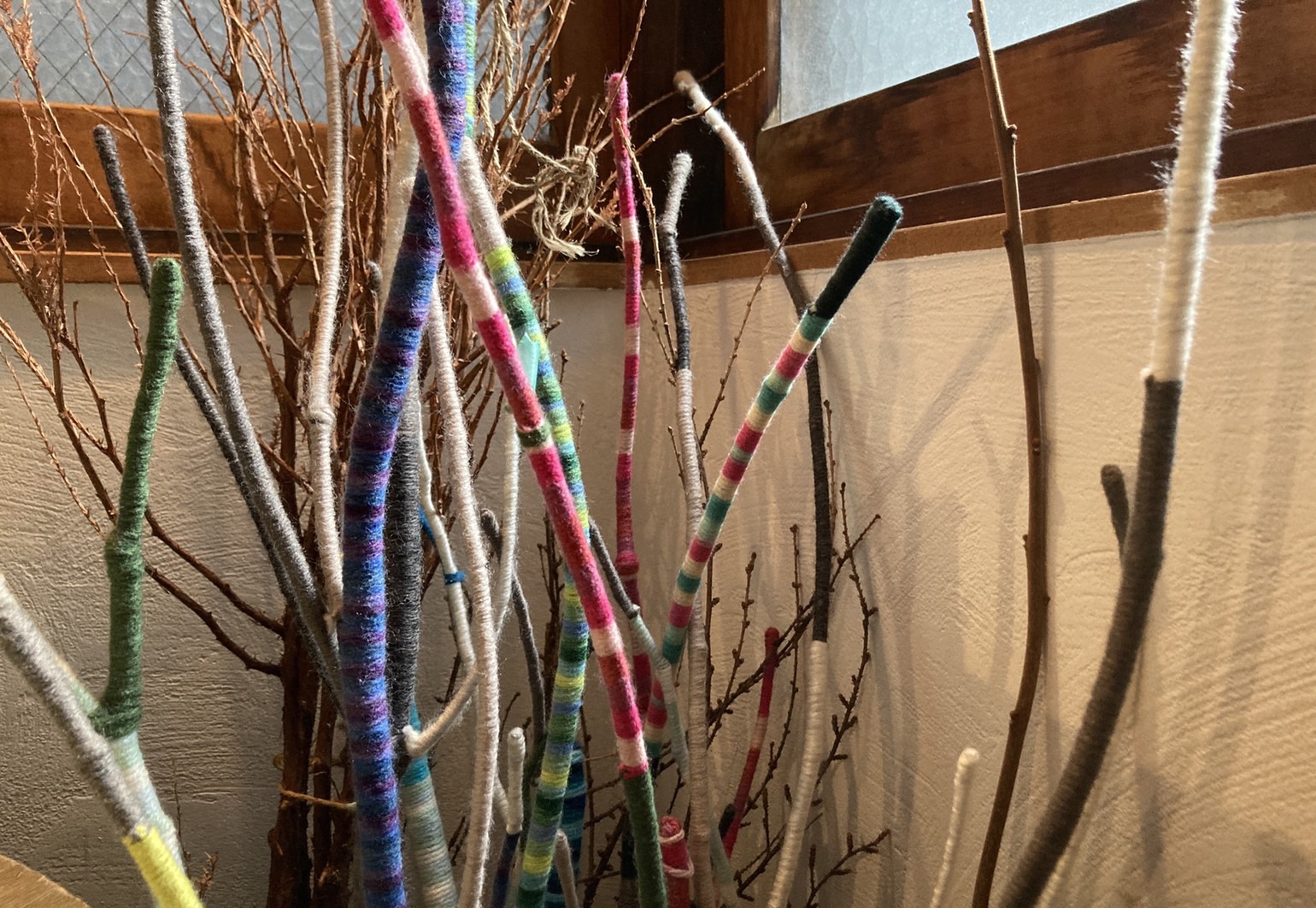 大きめの木の枝に毛糸を巻いて、柔らかい枝のオブジェをつくります。見た目のかわいさもさることながら、ひたすら巻き巻きする時間を楽しめる体験。難しい工程がないので、お子さんにもぜひ巻き巻きして欲しいです。