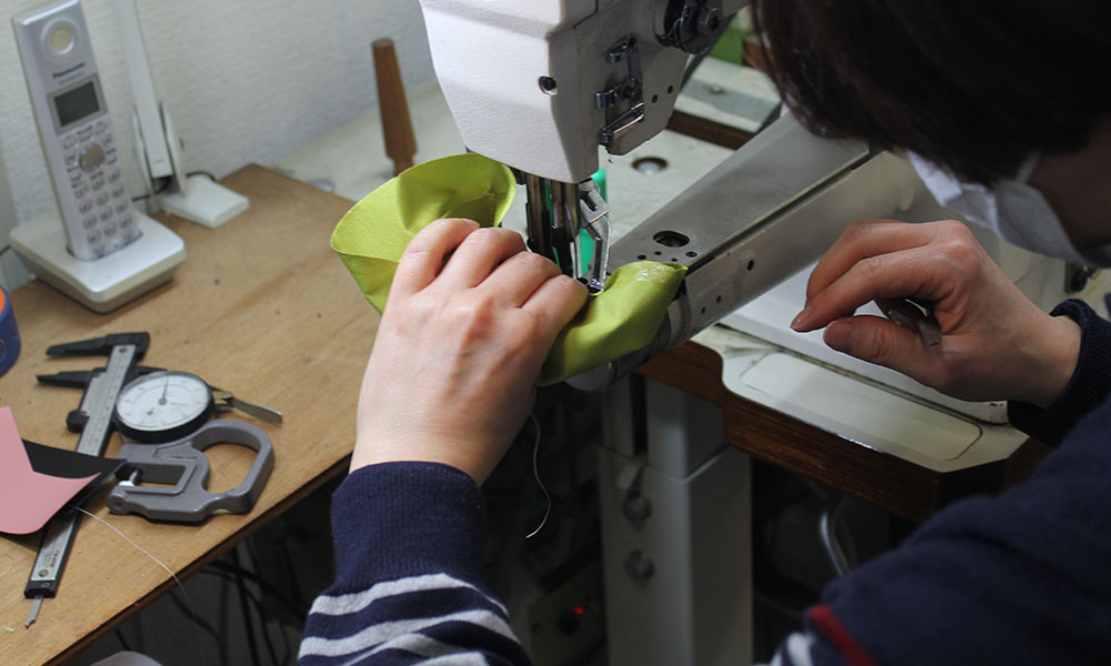 縫製が終われば、裏地と革とにゴムのりを付けて重ね合わせていきます。