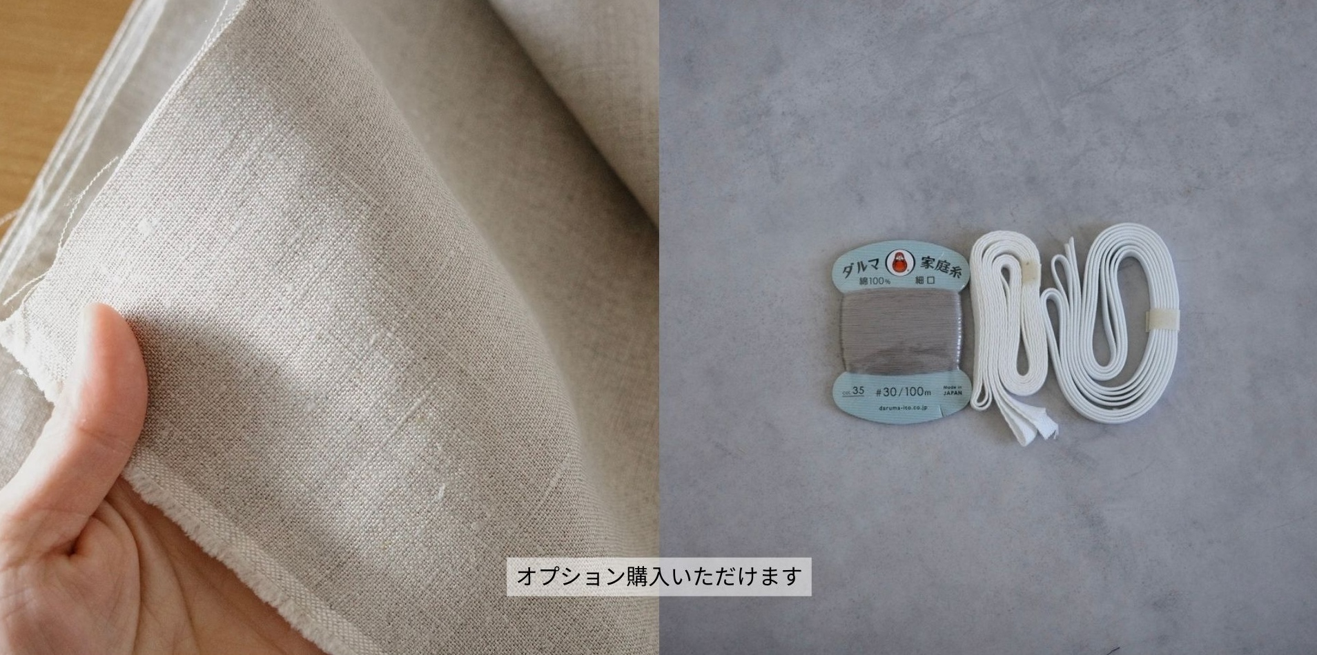 こちらで用意した材料を購入いただく場合、リネンの生成り生地を用意させていただきます。完成して生成りのズボンを楽しんだ後は、自分で草木染めするのも楽しいかもしれませんね。また、ウエストゴム・ウエスト紐・手縫い糸がセットになったものも販売してますので、必要な方は一緒にご注文ください。
