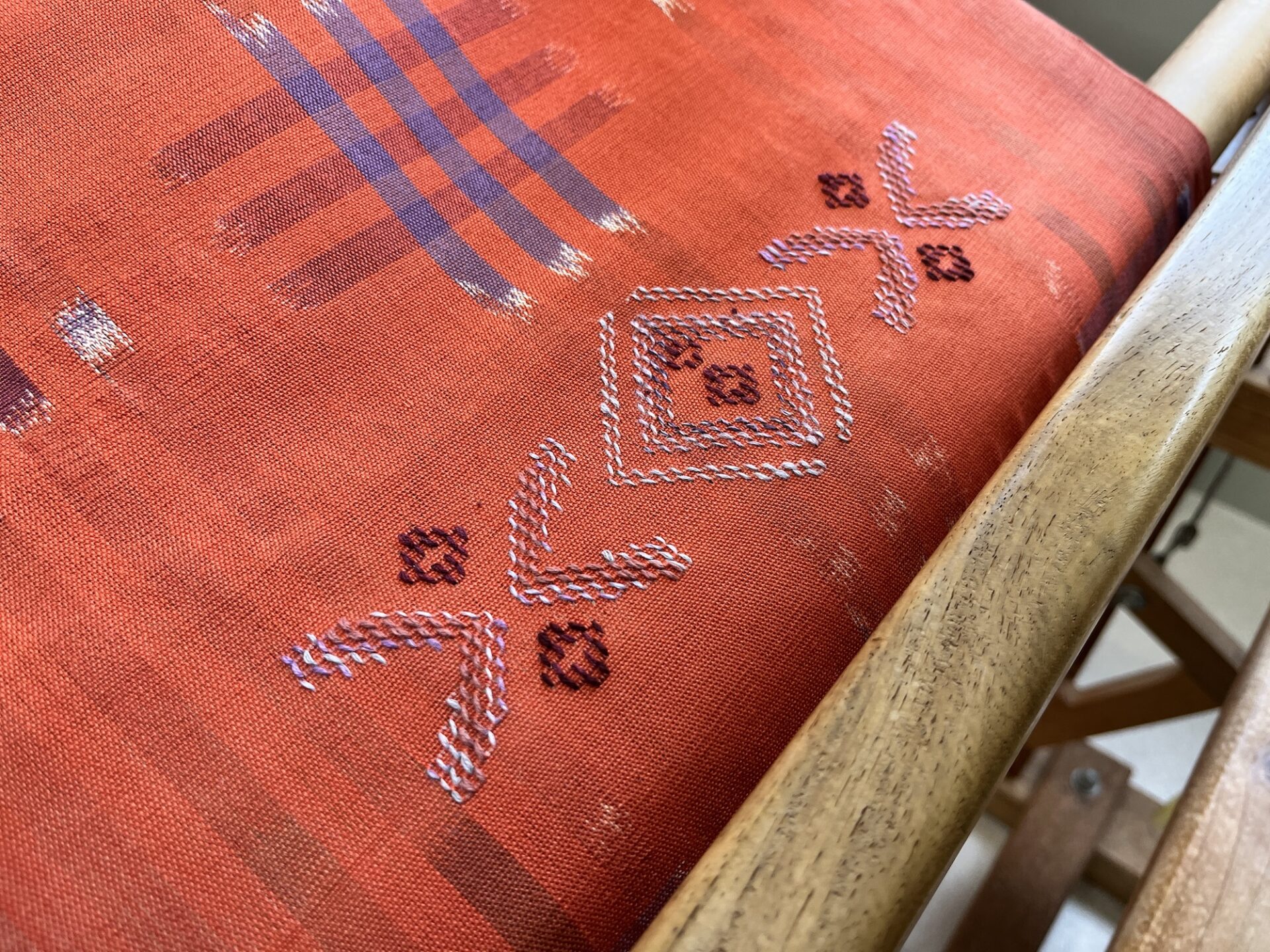 こちらが縫い取り花織。設計図を見ながら、手で色糸を加えながら折り込みます。知花では「てぃばな」と呼ばれます。