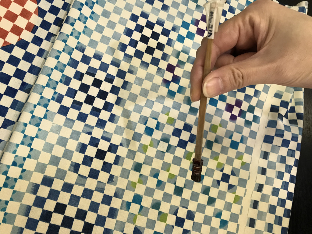 今回の体験のポイントは、予め生地に市松模様(オリンピックのロゴにも使われた格子柄ですね)の糊が置いてあること。つまりこの糊おきされた部分には色が入りません。