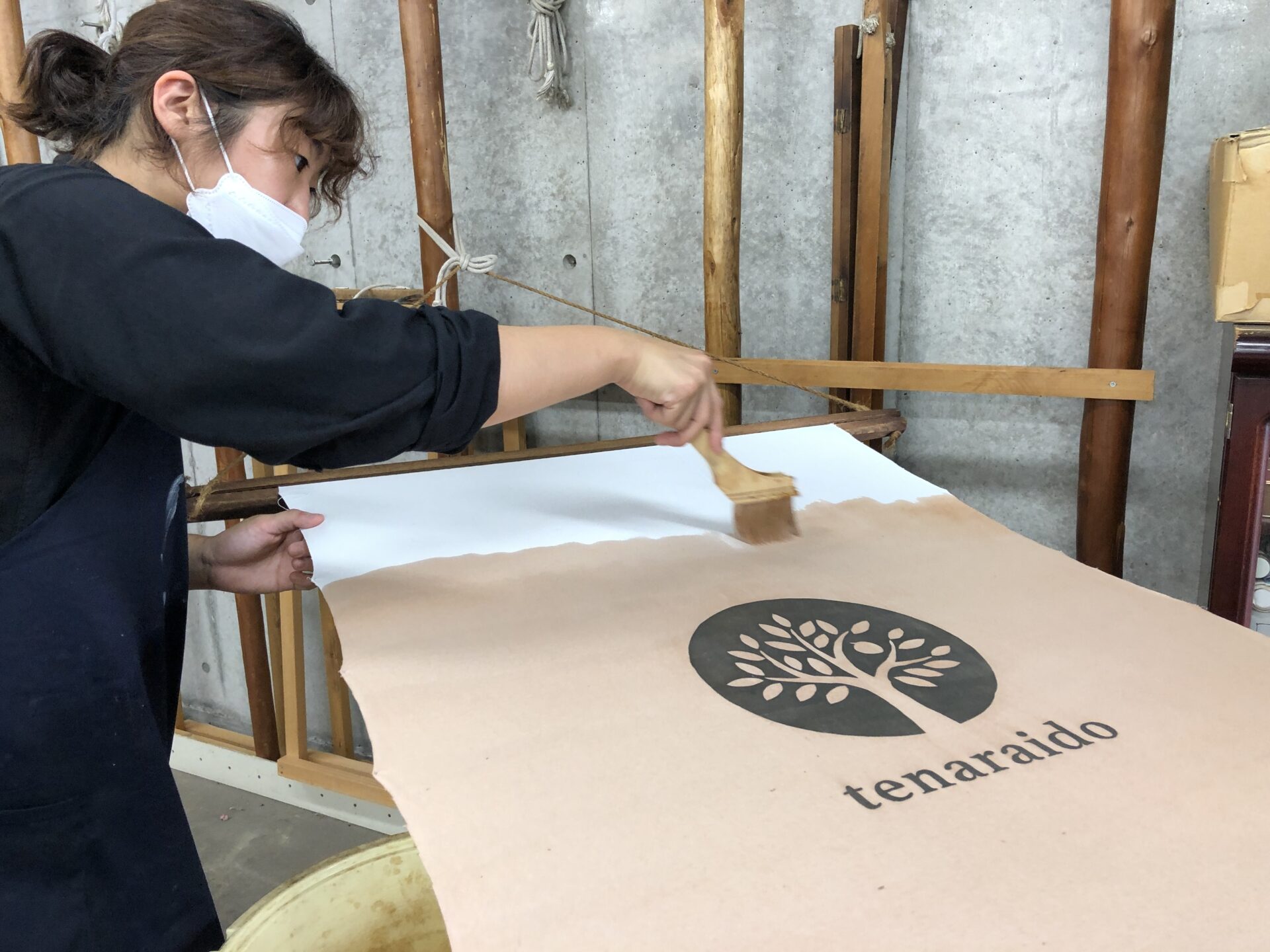 てならい堂でも柿渋染めで旗をつくりました。染めたては薄い色ですが、日に日に色が変化し、今はかなり濃くなっています。