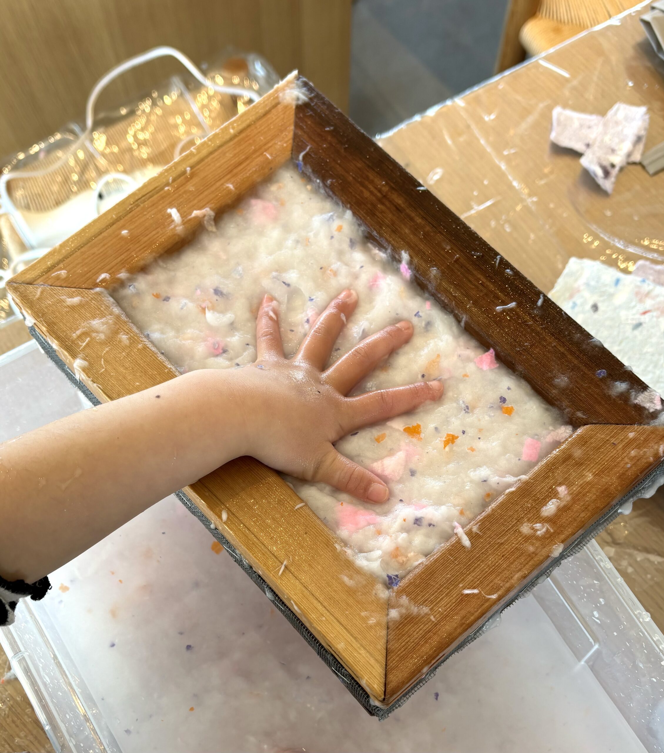 漉く素材や植物の匂い、水に手が触れる時の感覚、水が落ちる音、染められた紙の色味、乾燥した紙のテクスチャーなど五感をたっぷり使って紙を漉いてみましょう。