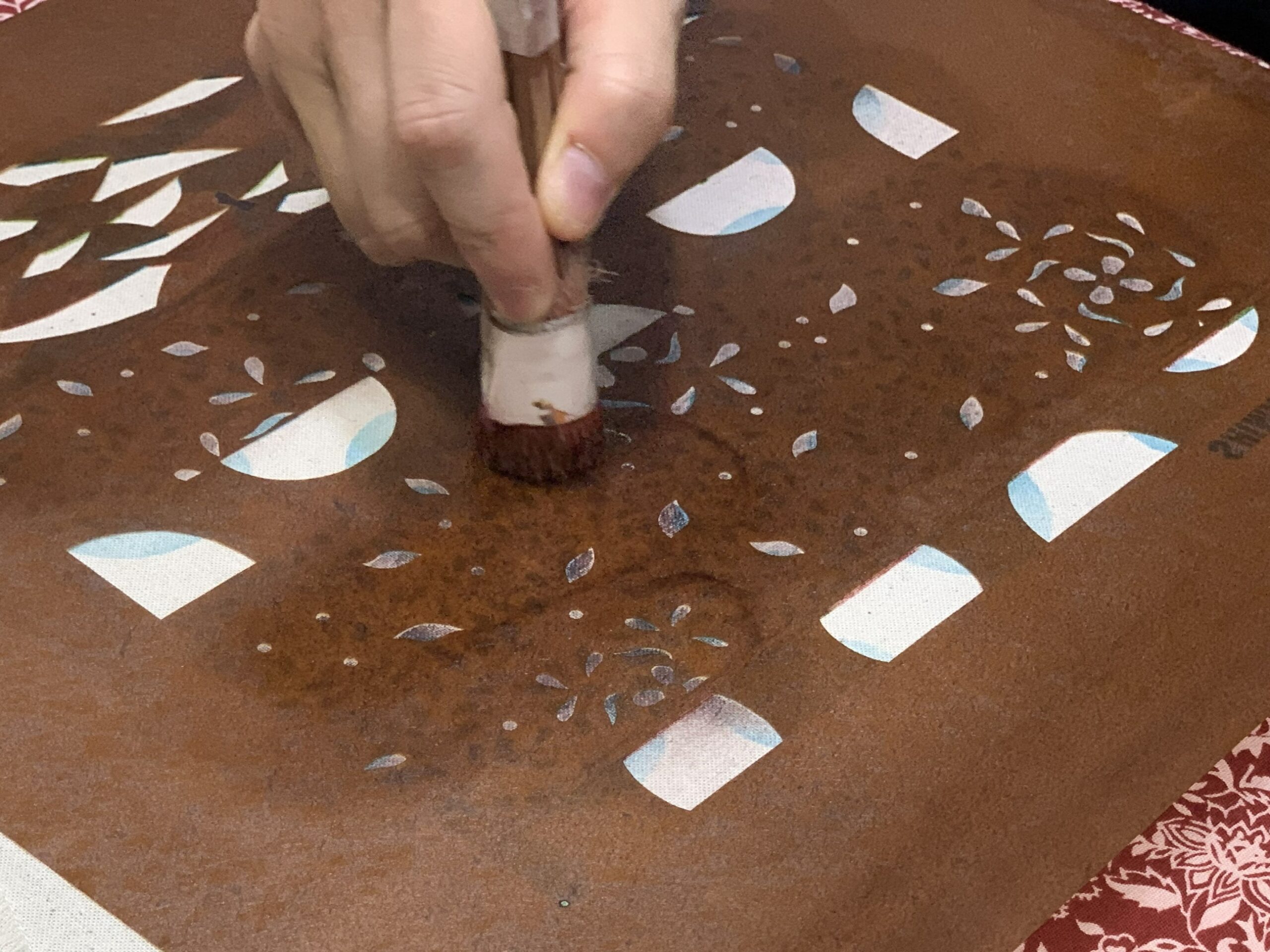 一枚染めては、次の型をのせてまた次の色で染めて、と、貴重な伊勢型紙を使って、段々と色が重なっていく楽しさを味わえますよ。
