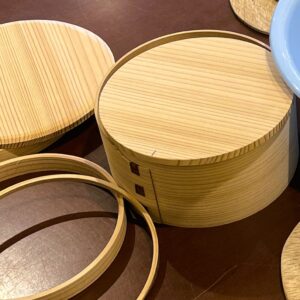 曲げわっぱ工房E08の曲げわっぱたち。桜の樺綴じ部分、かわいい…◎そしていまにも杉の良~いにおいがしてきそう・・・