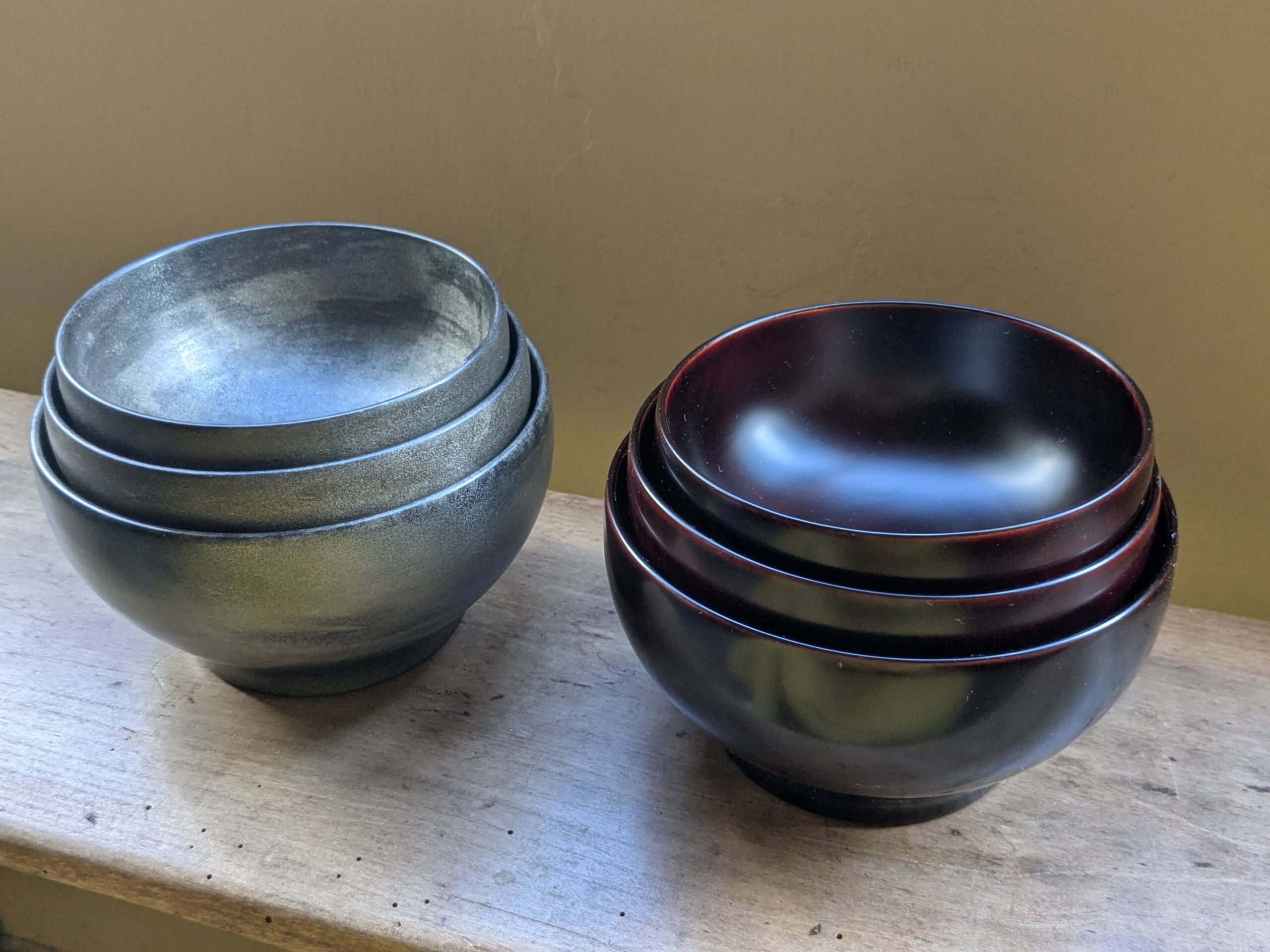 めぐるの三つ組椀。”水平”と”日月”。の2種類。色はそれぞれ4色。