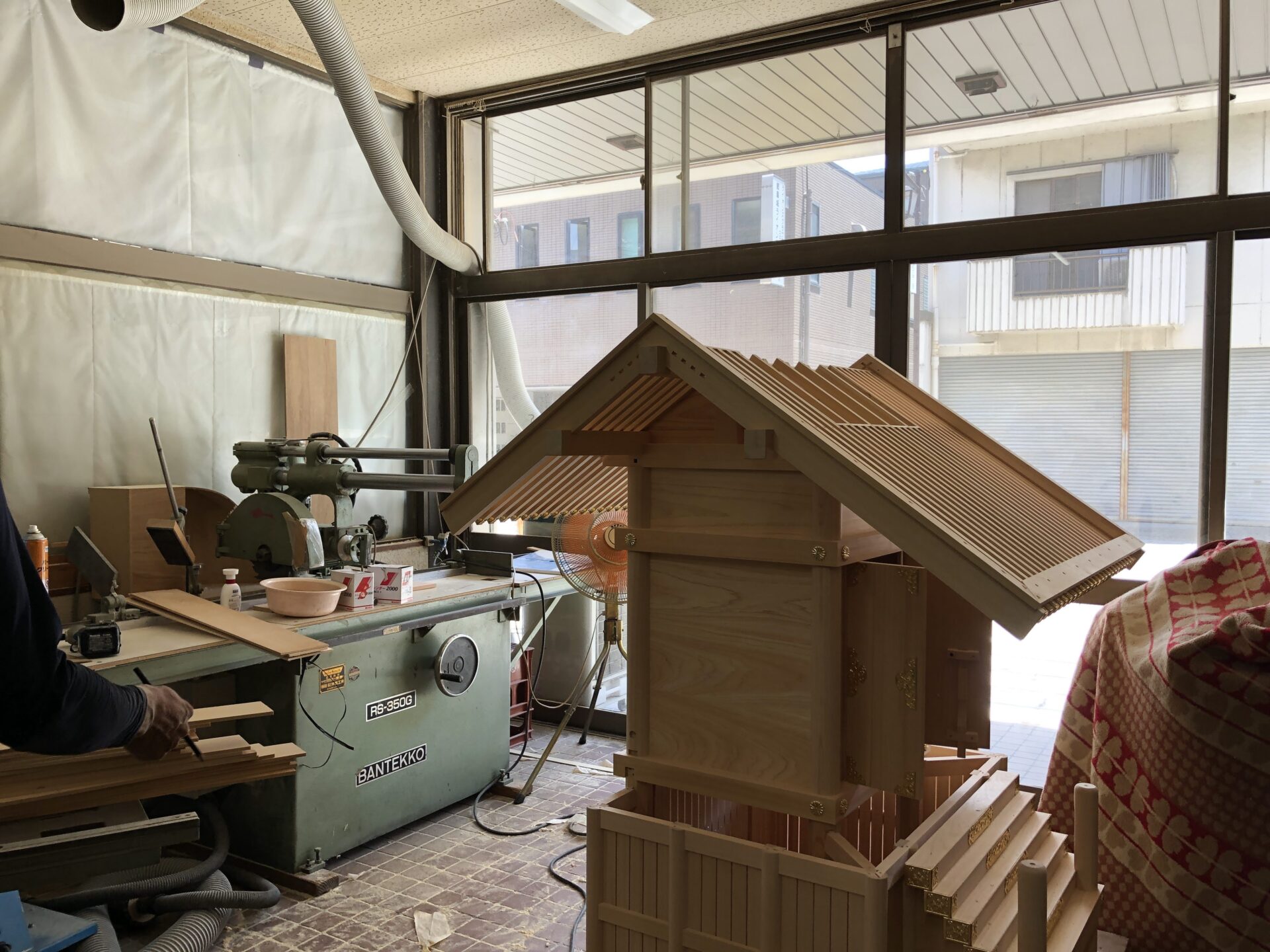 中には、制作途中のお社(やしろ)やお神輿、神棚などがそこここに。その形をよく観察して、宮大工さんからその意味を教えてもらうことで、神社をお参りする時の意識が変わるのは間違いないと思います。
