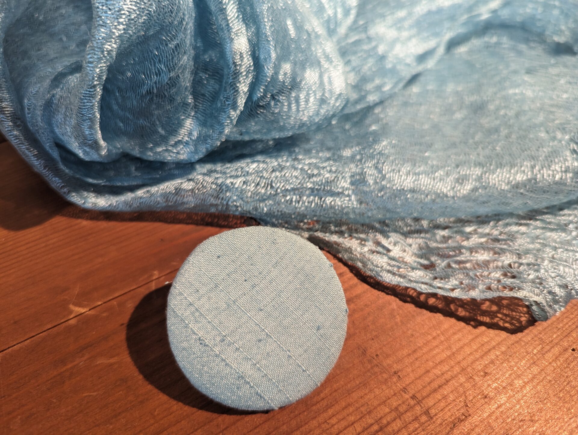 ブローチは小さい絹を生葉で染めて、くるみボタン(2.8センチ程度)を作り、後ろにブローチ用のピンを接着します。ストールと同時並行で一緒に染めながら作っていきますよ。